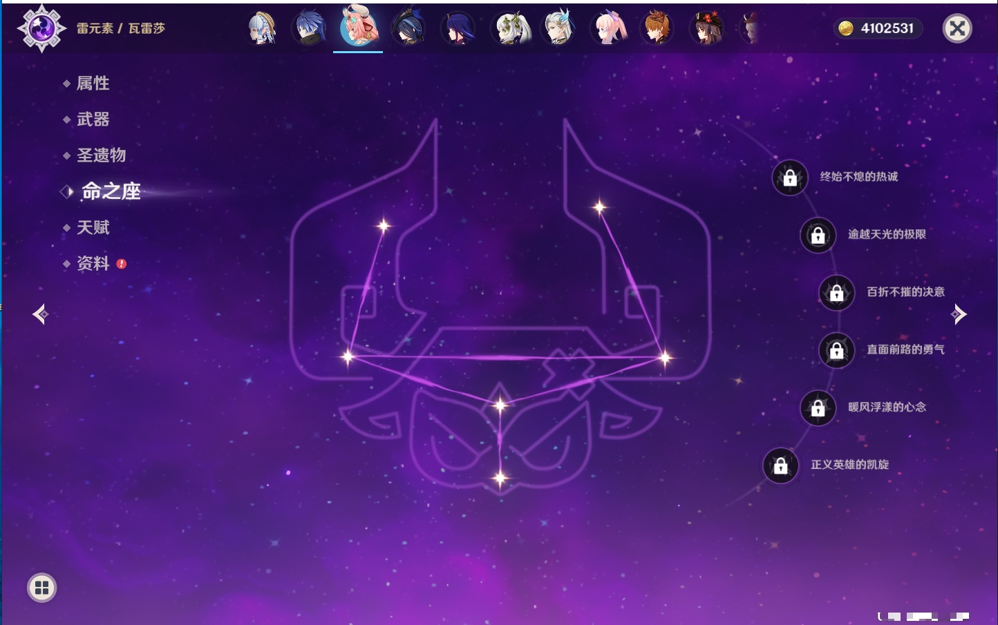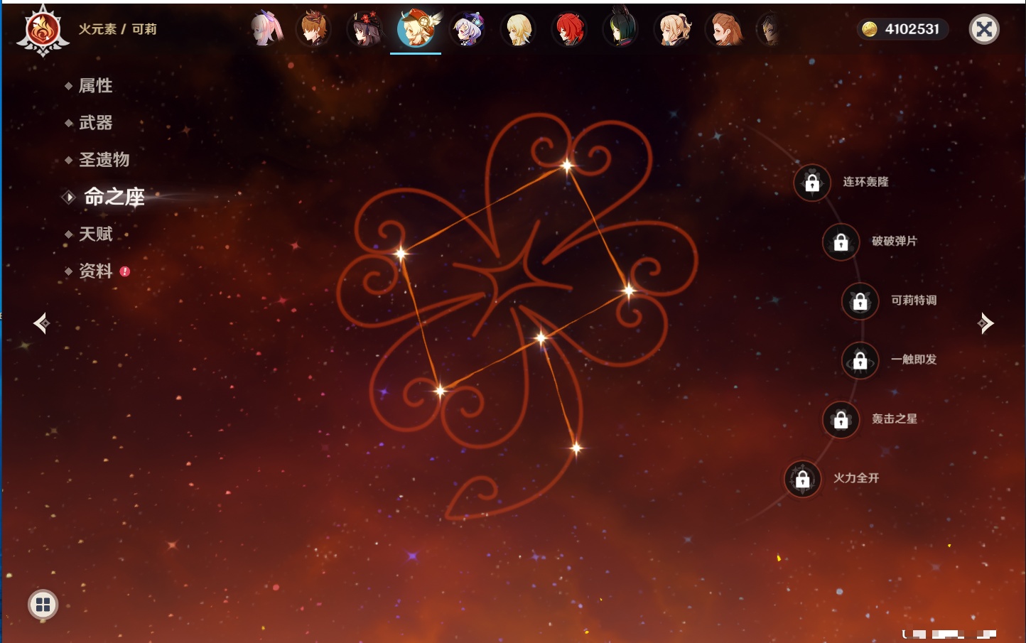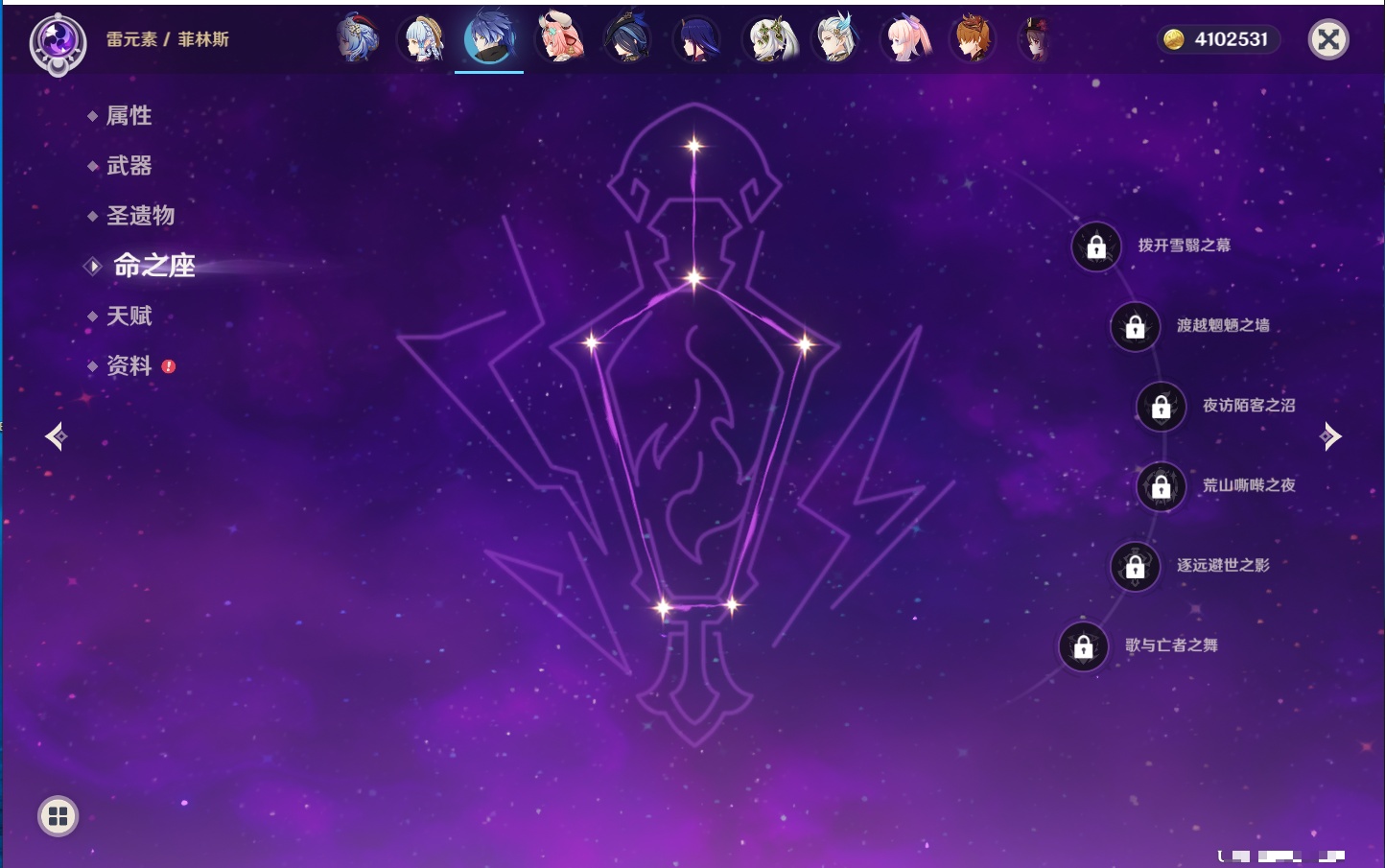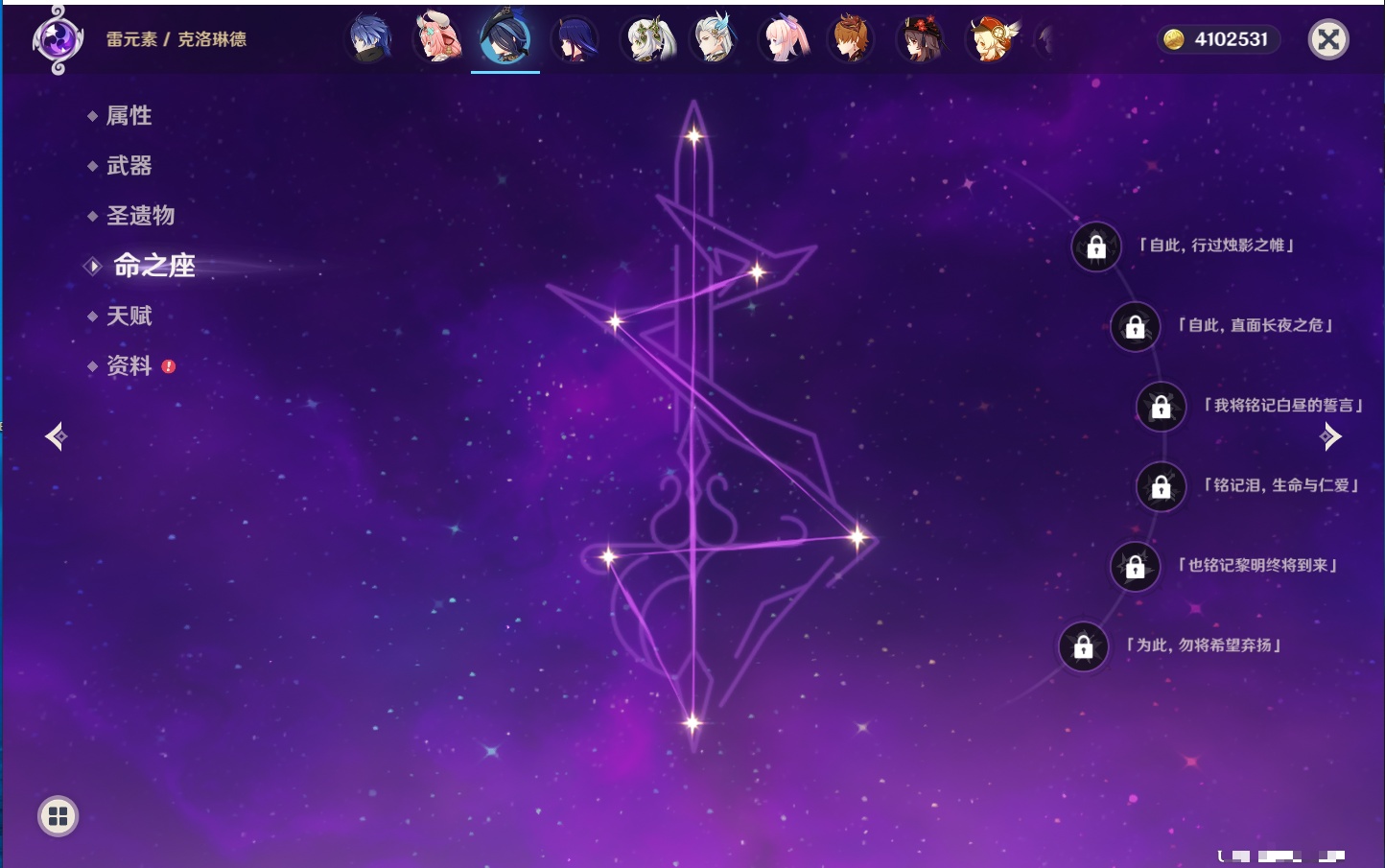 【26个五星角色】,满命七七,4命迪卢克,1命迪希雅,1命夜兰,1命雷电将军,1命胡桃,1命珊瑚宫心海,1命琴,0命克洛琳德,0命阿蕾奇诺,0命闲云,0命芙宁娜,0命那维莱特,0命纳西妲,0命提纳里,0命荒泷一斗,0命优菈,0命枫原万叶,0命神里绫华,0命钟离,0命甘雨,0命魈,0命可莉,0命达达利亚,0命菲林斯,0命瓦雷莎,