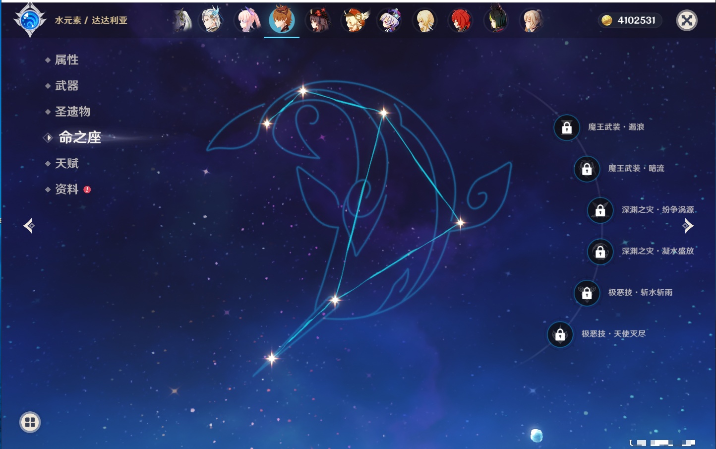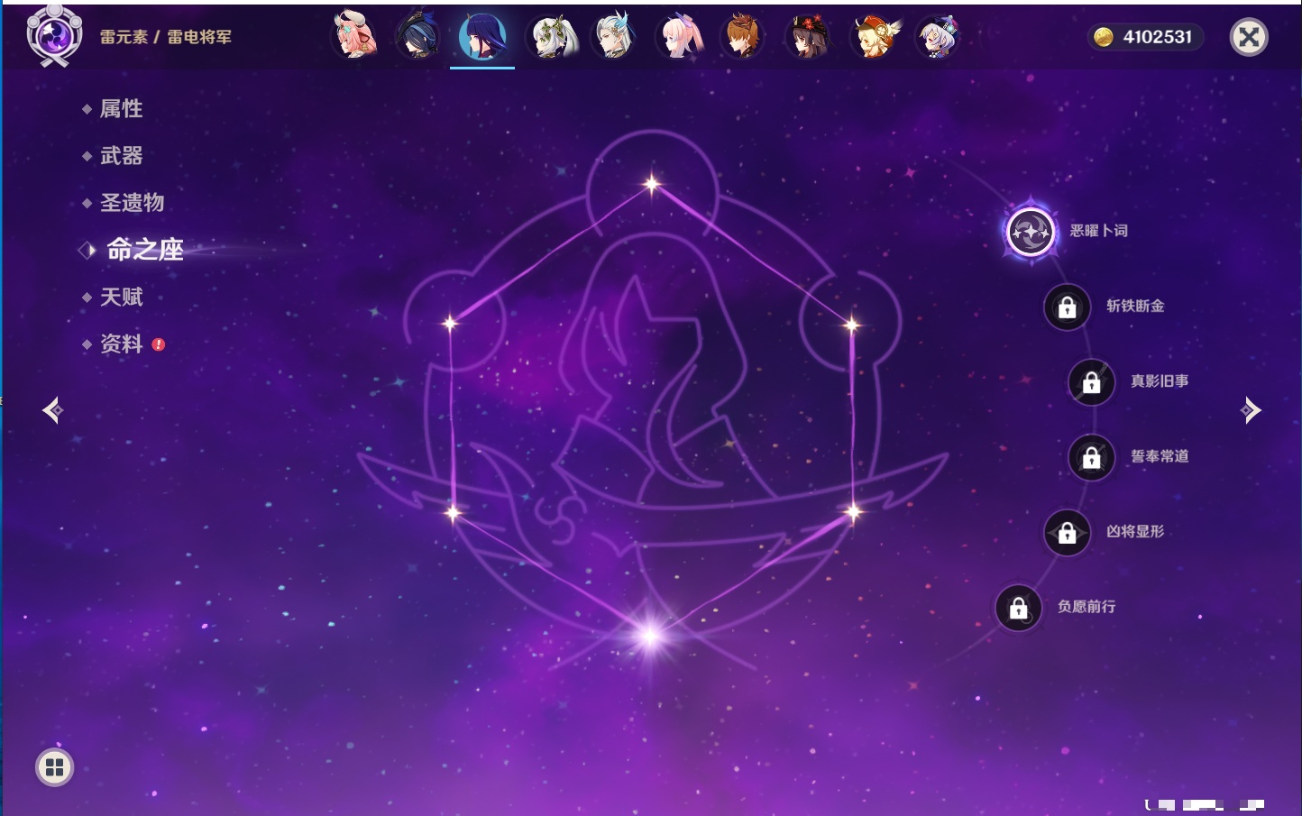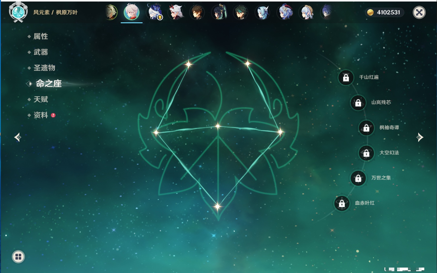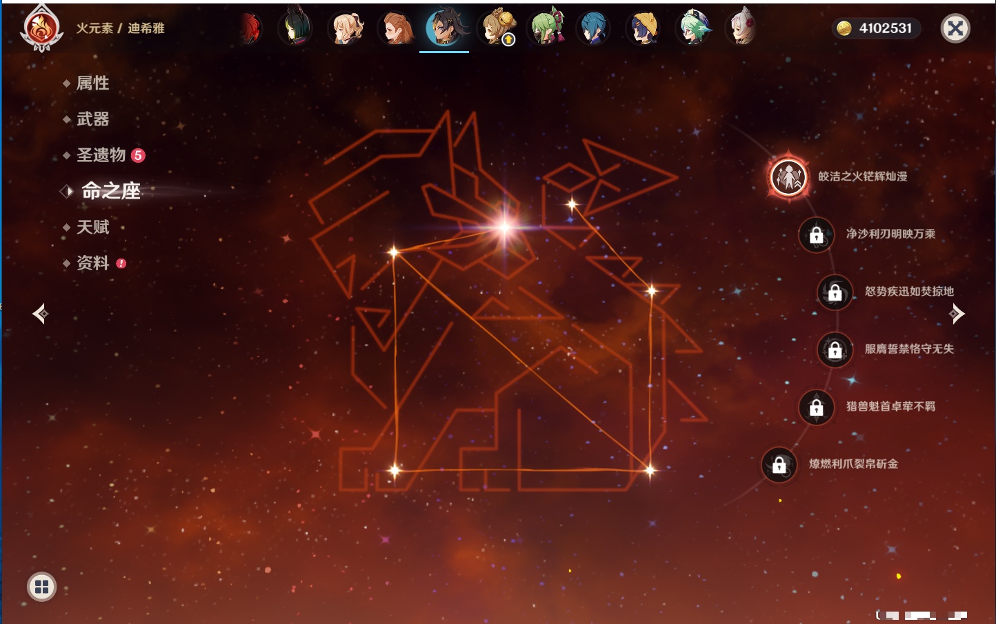【26个五星角色】,满命七七,4命迪卢克,1命迪希雅,1命夜兰,1命雷电将军,1命胡桃,1命珊瑚宫心海,1命琴,0命克洛琳德,0命阿蕾奇诺,0命闲云,0命芙宁娜,0命那维莱特,0命纳西妲,0命提纳里,0命荒泷一斗,0命优菈,0命枫原万叶,0命神里绫华,0命钟离,0命甘雨,0命魈,0命可莉,0命达达利亚,0命菲林斯,0命瓦雷莎,