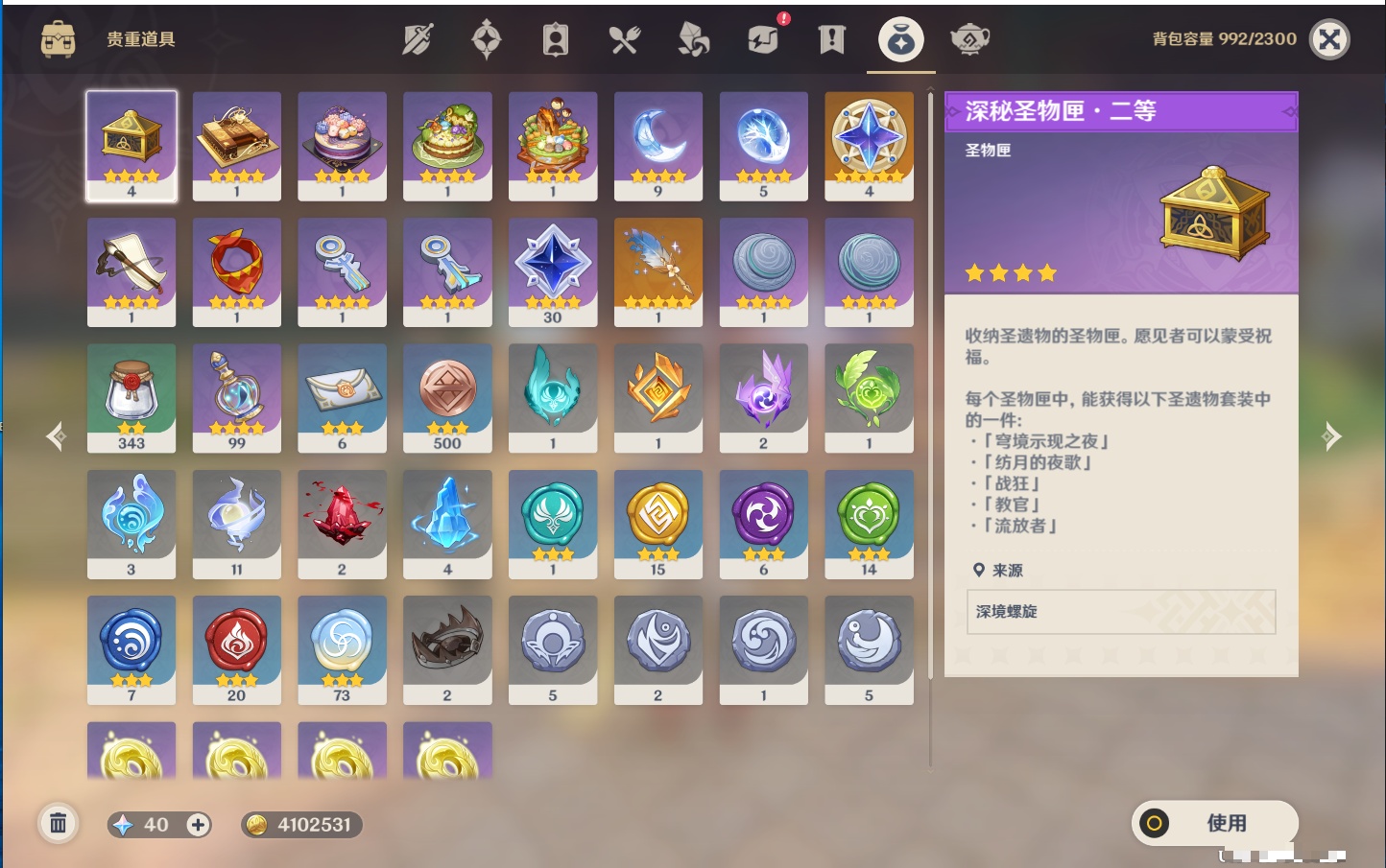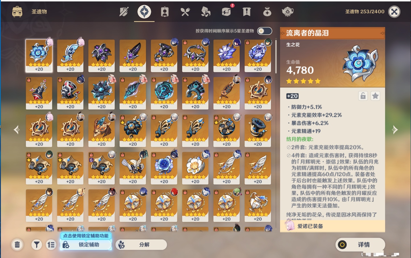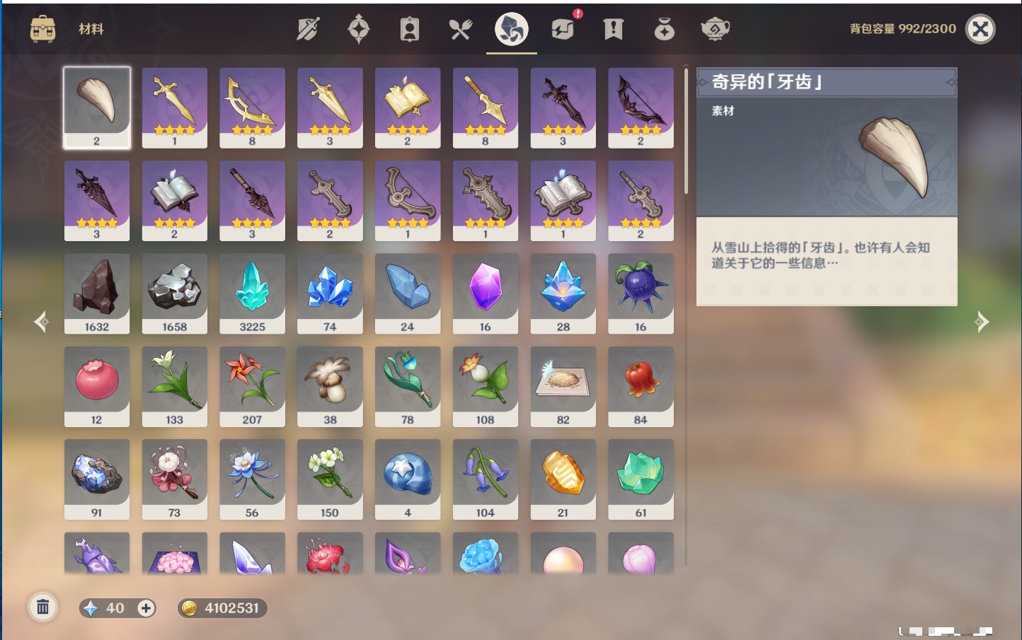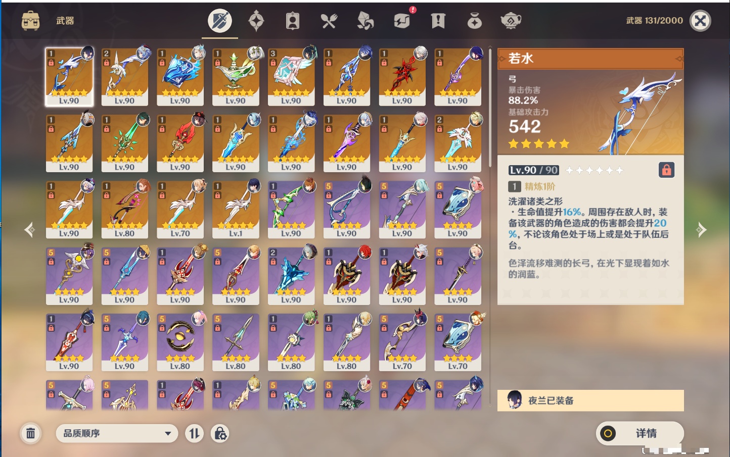 【20个五星武器】,精3天空之卷,精2阿莫斯之弓,精2天空之刃,精1若水,精1万世流涌大典,精1千夜浮梦,精1血染荒城,精1赤月之形,精1薙草之稻光,精1息灾,精1和璞鸢,精1护摩之杖,精1松籁响起之时,精1静水流涌之辉,精1雾切之回光,精1苍古自由之誓,精1风鹰剑,精1最初的大魔术,