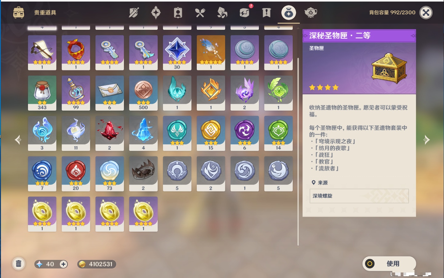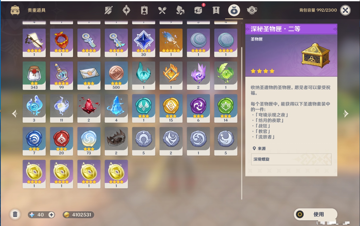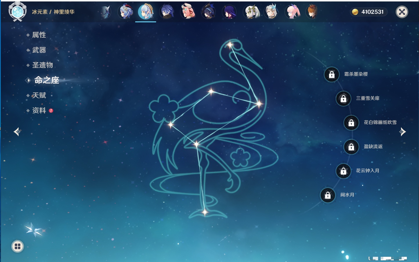 【20个五星武器】,精3天空之卷,精2阿莫斯之弓,精2天空之刃,精1若水,精1万世流涌大典,精1千夜浮梦,精1血染荒城,精1赤月之形,精1薙草之稻光,精1息灾,精1和璞鸢,精1护摩之杖,精1松籁响起之时,精1静水流涌之辉,精1雾切之回光,精1苍古自由之誓,精1风鹰剑,精1最初的大魔术,