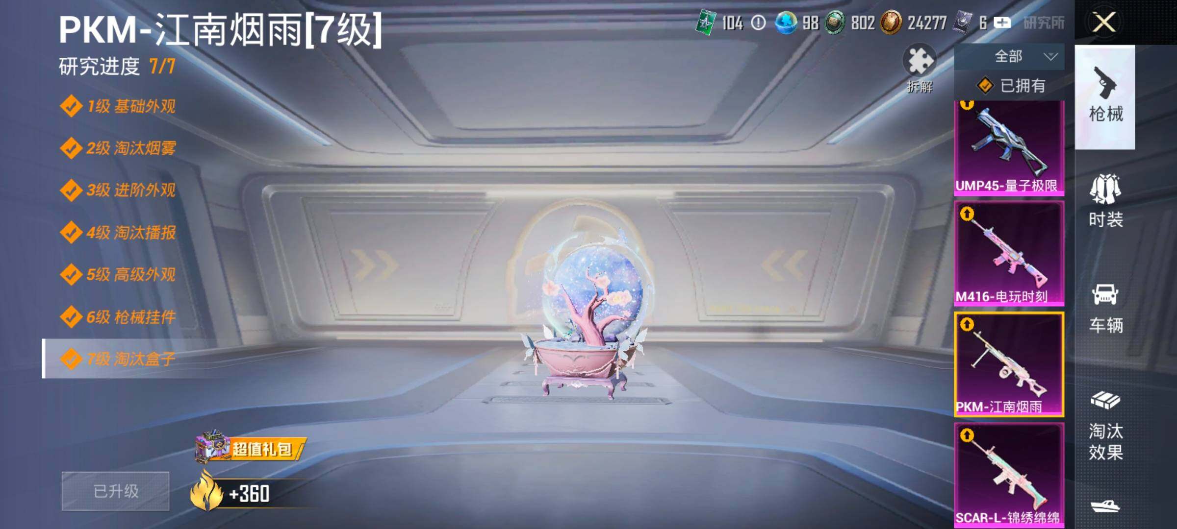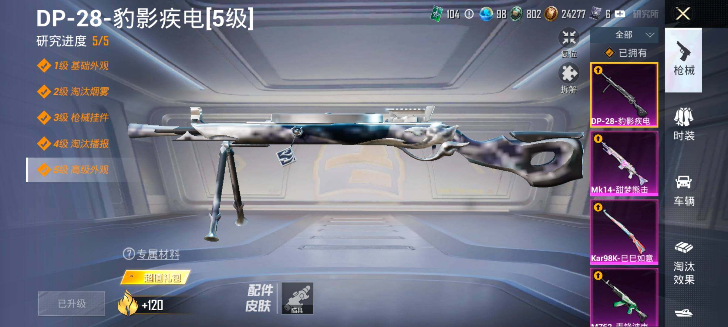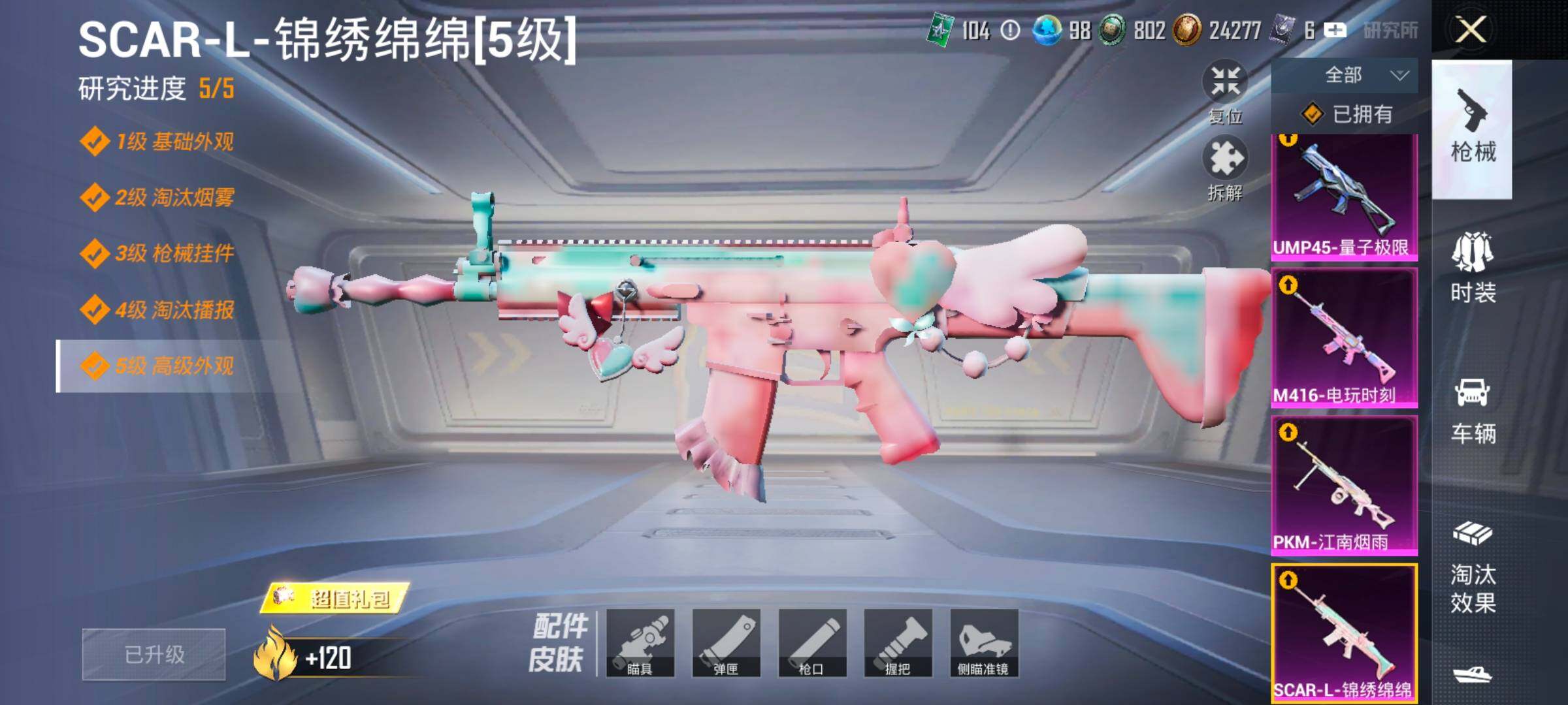 【8特效枪】,SCAR-L-锦绣绵绵,(5级),M416-电玩时刻,(5级),Kar98K-巳巳如意,(5级),M762-青锋波束,(5级),DP-28-豹影疾电,(5级),PKM-江南烟雨,(7级),UMP45-量子极限,(5级),Mk14-甜梦熊击,(5级),