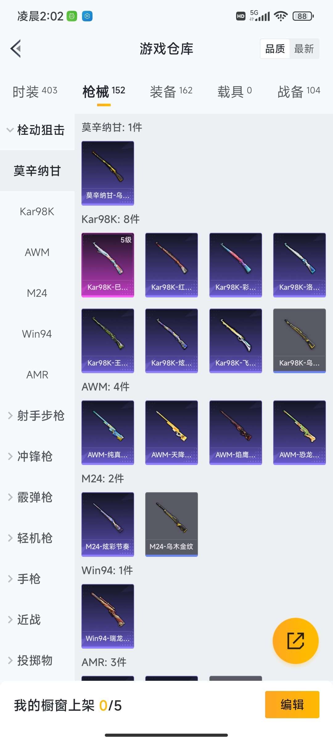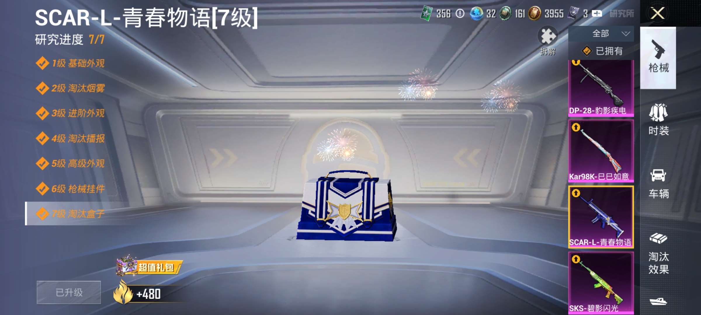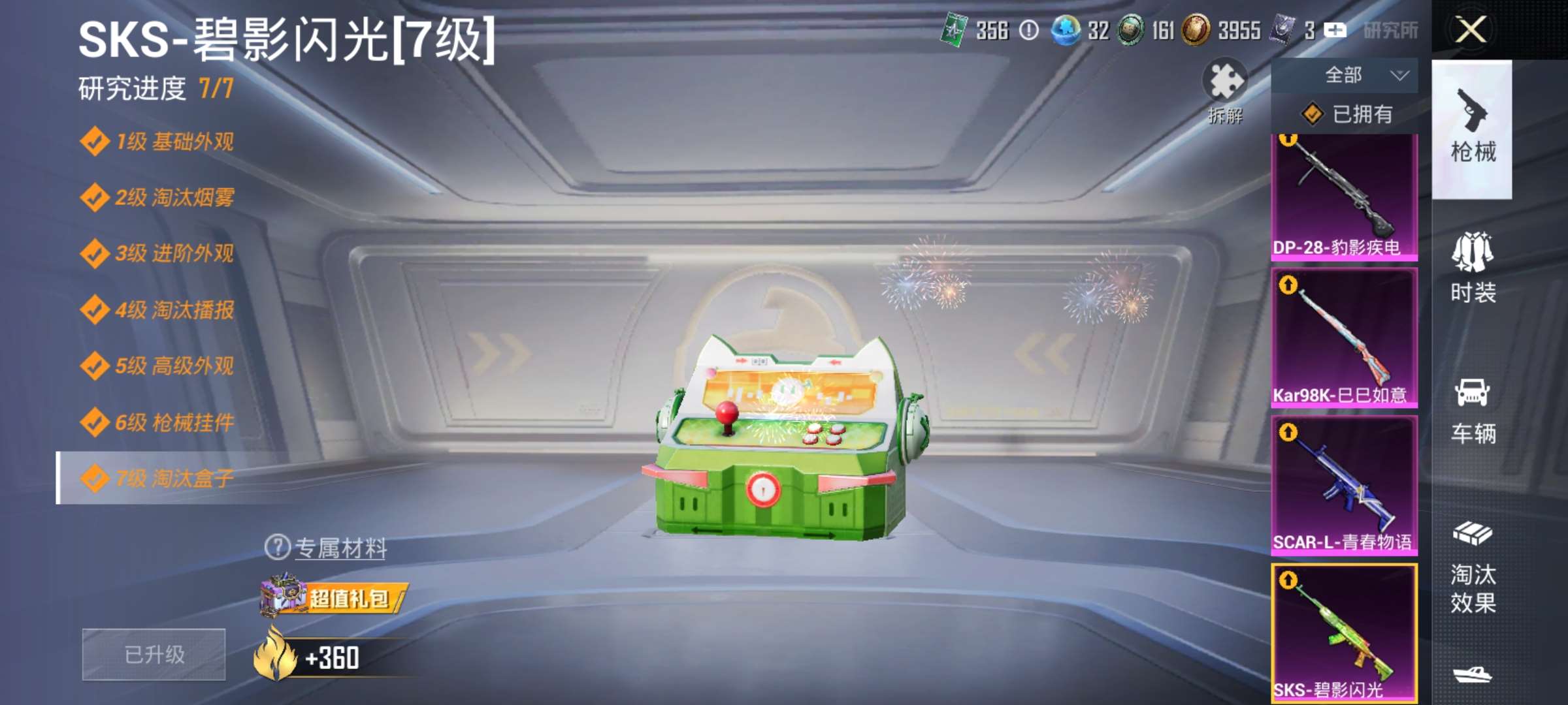 【4特效枪】,Kar98K-巳巳如意,(5级),DP-28-豹影疾电,(5级),SKS-碧影闪光,(7级),SCAR-L-青春物语,(7级),