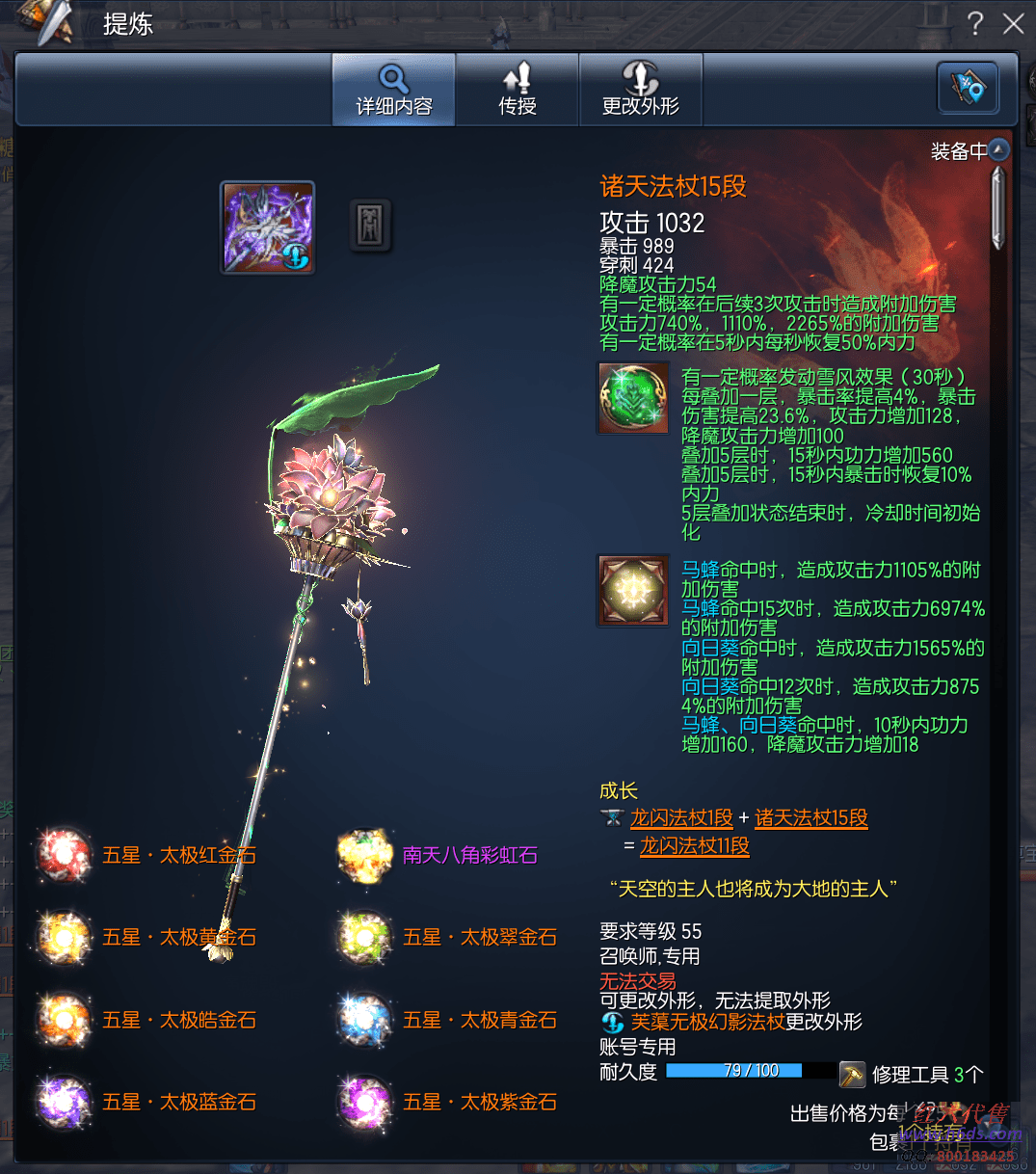 12577,无日峰召唤师,侠义团134段,五星太极石x7,南天八角彩虹石,雪峰元气石15段,征伐真气石15段,曜皇法杖11段,诸天法杖15段,卓越蟠桃戒指3段,卓越雪峰耳环3段,卓越雪峰项链3段,极虎手镯6段,神山腰带12段,天佑手套12段 ,朦花秘功牌8段,武天神功牌8段,武学神功牌8段,苦痛梦幻魂15段,毁灭南天魂15段,黄龙灵15段,青天守护石2段,晨晖星15段,衣服500,《可交易材料不算》22000R,