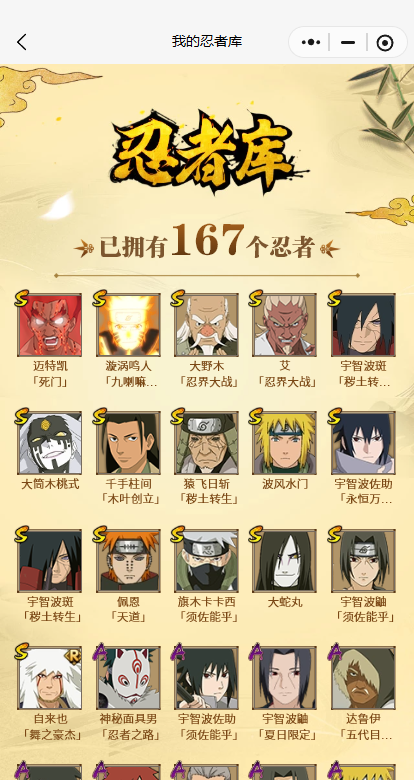 【A忍者】,长十郎「六代目水影」,日向宁次「忍界大战」,漩涡博人「桃式显现」,宇智波鼬「夏日限定」,旗木卡卡西「幻之真容」,李洛克「忍界大战」,宇智波泉奈,长门「青年」,艾「青年」,达鲁伊「五代目雷影」,神秘面具男「忍者之路」,波风水门「青年」,奇拉比「忍界大战」,宇智波佐助「须佐能乎」,迪达拉「秽土转生」,千代「近松十人卫」,宇智波鼬「新春限定」,秋道丁次「忍界大战」,宇智波佐助「万花筒写轮眼」,飞段「死司凭血」,飞段,我爱罗「疾风传」,蝎,干柿鬼鲛,宇智波鼬,猿飞阿斯玛,迈特凯,