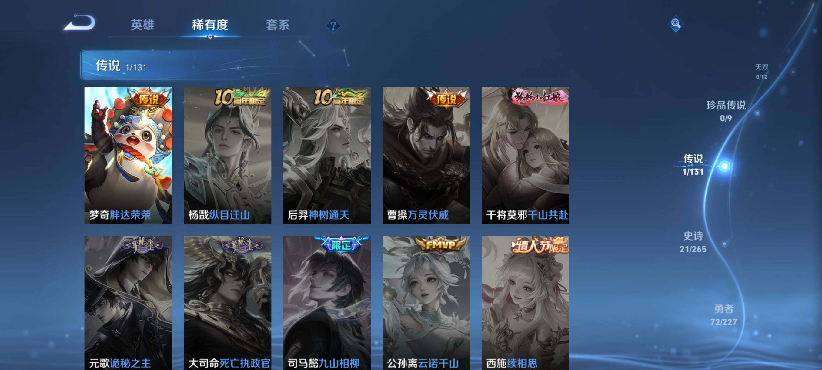 【赛季限定】:夏侯惇朔风刀,狄仁杰万华元夜,达摩沙漠行僧,老夫子醍醐杖,程咬金演武夺筹,兰陵王金庭之子,李元芳云中旅人,钟馗驱傩正仪,鬼谷子原初探秘者,苏烈千军破阵,弈星混沌棋,沈梦溪大漠名商,明世隐疑决卦,盾山御銮,桑启海盐诗旅