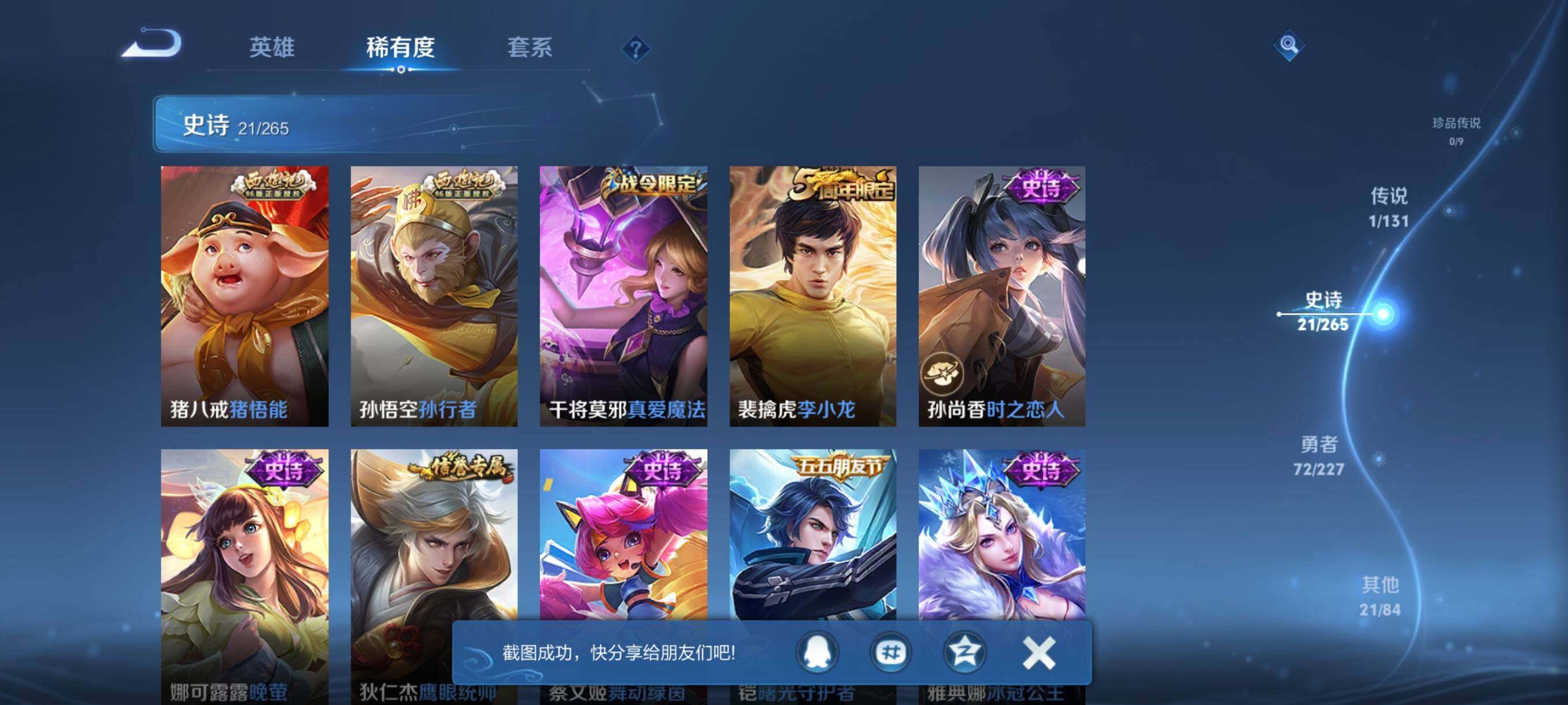 【史诗皮肤】:甄姬冰雪圆舞曲,廉颇地狱岩魂,孙尚香水果甜心,妲己魅力维加斯,墨子龙骑士,吕布圣诞狂欢,李白千年之狐,孙悟空至尊宝,刘邦德古拉伯爵,夏侯惇乘风破浪,亚瑟心灵战警,雅典娜冰冠公主,铠曙光守护者,蔡文姬舞动绿茵,狄仁杰鹰眼统帅,娜可露露晚萤,孙尚香时之恋人,裴擒虎李小龙,干将莫邪真爱魔法,孙悟空孙行者,猪八戒猪悟能