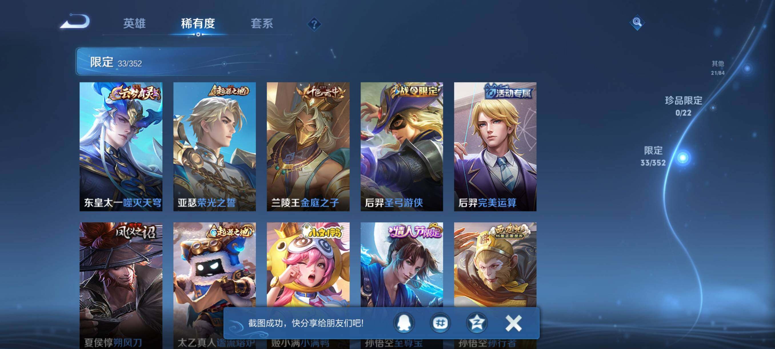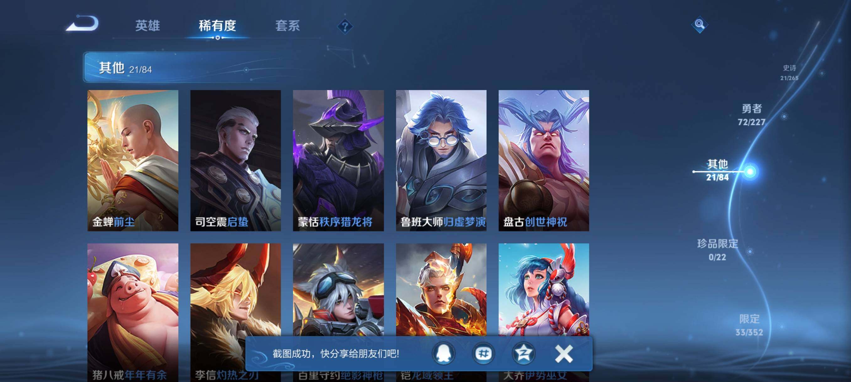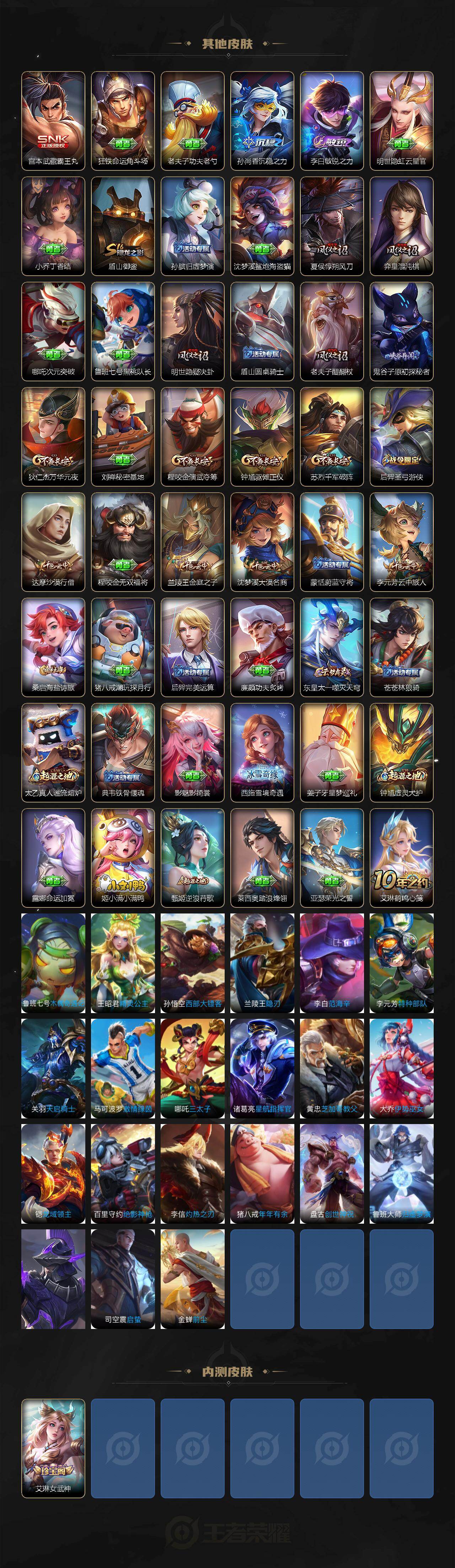 【其他皮肤】:项羽海滩派对,韩信教廷特使,韩信街头霸王,露娜哥特玫瑰,达摩大发明家,赵云白执事,赵云忍炎影,艾琳女武神,程咬金星际陆战队,白起白色死神,牛魔西部大镖客,扁鹊化身博士,宫本武藏未来纪元,安琪拉玩偶对对碰,妲己少女阿狸,典韦黄金武士,亚瑟死亡骑士,达摩拳王,花木兰兔女郎,宫本武藏万象初新,后羿阿尔法小队,狄仁杰阴阳师,刘备汉昭烈帝,钟无艳海滩丽影,宫本武藏霸王丸,狂铁命运角斗场,老夫子功夫老勺,孙尚香沉稳之力,李白敏锐之力,明世隐虹云星官,小乔丁香结,盾山御銮,孙膑归虚梦演,沈梦溪鲨炮海盗猫,夏侯惇朔风刀,弈星混沌棋,哪吒次元突破,鲁班七号黑桃队长,明世隐疑决卦,盾山圆桌骑士,老夫子醍醐杖,鬼谷子原初探秘者,狄仁杰万华元夜,刘禅秘密基地,程咬金演武夺筹,钟馗驱傩正仪,苏烈千军破阵,后羿圣弓游侠,达摩沙漠行僧,程咬金无双福将,兰陵王金庭之子,沈梦溪大漠名商,蒙恬蔚蓝守将,李元芳云中旅人,桑启海盐诗旅,猪八戒潮玩探月行,后羿完美运算,廉颇功夫炙烤,东皇太一噬灭天穹,苍苍林狼骑,太乙真人谧流