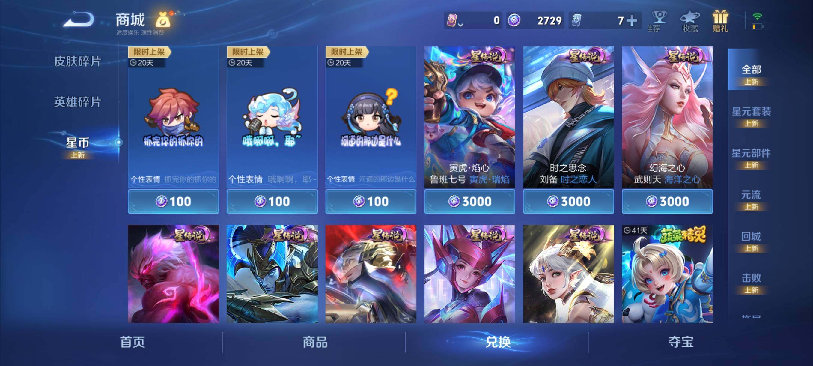 【限定皮肤】:狄仁杰阴阳师,夏侯惇朔风刀,狄仁杰万华元夜,达摩沙漠行僧,项羽海滩派对,老夫子醍醐杖,程咬金演武夺筹,兰陵王金庭之子,孙悟空至尊宝,孙悟空孙行者,后羿圣弓游侠,李元芳云中旅人,钟馗驱傩正仪,干将莫邪真爱魔法,鬼谷子原初探秘者,苏烈千军破阵,弈星混沌棋,沈梦溪大漠名商,明世隐疑决卦,裴擒虎李小龙,盾山御銮,猪八戒猪悟能,桑启海盐诗旅,艾琳女武神