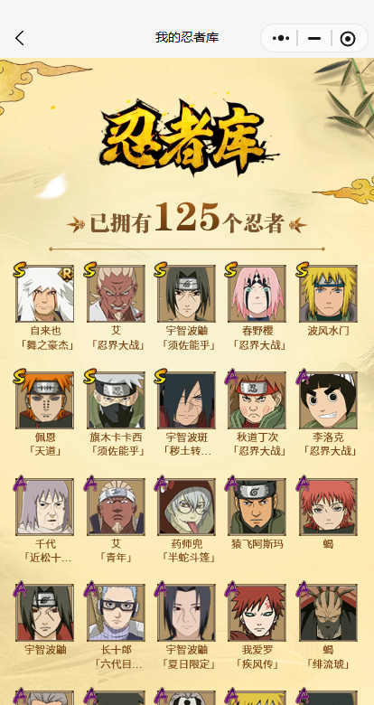 【A忍者】,长十郎「六代目水影」,漩涡博人「桃式显现」,宇智波鼬「夏日限定」,李洛克「忍界大战」,蝎「绯流琥」,宇智波泉奈,神农「羁绊」,艾「青年」,波风水门「青年」,宇智波佐助「须佐能乎」,漩涡鸣人「九尾查克拉」,千代「近松十人卫」,药师兜「半蛇斗篷」,秋道丁次「忍界大战」,猿飞阿斯玛「秽土转生」,猿飞日斩「火影继承人」,飞段「死司凭血」,飞段,我爱罗「疾风传」,蝎,干柿鬼鲛,宇智波鼬,猿飞阿斯玛,迈特凯,