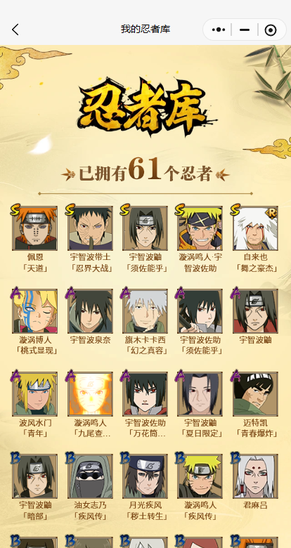 【A忍者】,迈特凯「青春爆炸」,漩涡博人「桃式显现」,宇智波鼬「夏日限定」,旗木卡卡西「幻之真容」,宇智波泉奈,波风水门「青年」,宇智波佐助「须佐能乎」,漩涡鸣人「九尾查克拉」,宇智波佐助「万花筒写轮眼」,宇智波鼬,