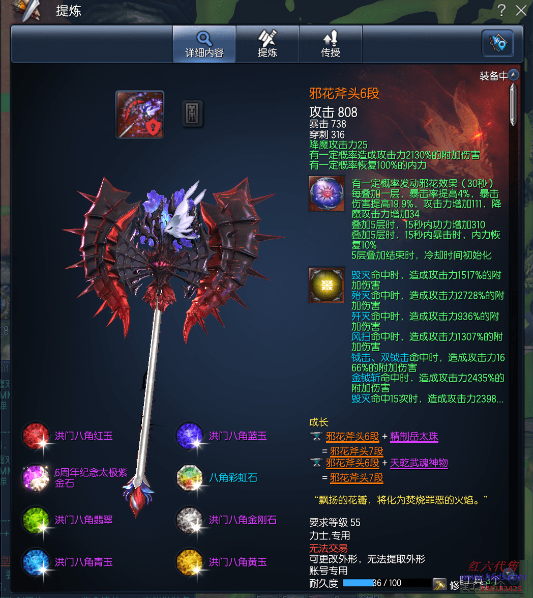 12624,火线区直上云霄力士,侠义团49段,邪花元气石8段,天罚真气石9段,邪花斧头6段,天目戒指10段,卓越邪花耳环3段,邪花项链8段,光雾手镯5段,狂天腰带1段,天佑手套8段,刚仑秘功牌,觉醒无藏神功牌2段,苦痛梦幻魂8段,觉醒凤凰灵8段,烬灭守护石5段,雷神星8段,衣服26, 800R,
