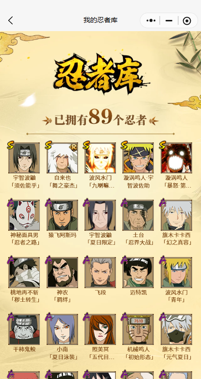 【A忍者】,机械鸣人「初始形态」,大野木「侠隐江湖」,迈特凯「青春爆炸」,土台「忍界大战」,长十郎「六代目水影」,宇智波鼬「夏日限定」,旗木卡卡西「幻之真容」,神农「羁绊」,桃地再不斩「秽土转生」,神秘面具男「忍者之路」,波风水门「青年」,旗木卡卡西「元气夏日」,小南「夏日泳装」,照美冥「五代目水影」,飞段,蝎,干柿鬼鲛,猿飞阿斯玛,迈特凯,