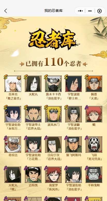 【S忍者】,宇智波斑「秽土转生·解」,宇智波佐助「永恒万花筒」,宇智波带土「忍界大战」,自来也「舞之豪杰」,旗木卡卡西「须佐能乎」,宇智波鼬「须佐能乎」,佩恩「天道」,波风水门,大蛇丸,