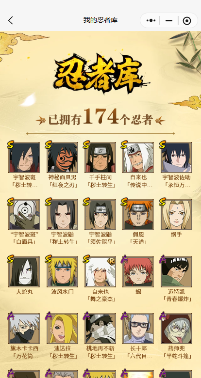 【A忍者】,迈特凯「青春爆炸」,长十郎「六代目水影」,日向宁次「忍界大战」,漩涡博人「桃式显现」,旗木卡卡西「幻之真容」,宇智波泉奈,桃地再不斩「秽土转生」,达鲁伊「五代目雷影」,波风水门「青年」,奇拉比「忍界大战」,飞段「恶灵之影」,宇智波佐助「须佐能乎」,迪达拉「秽土转生」,漩涡鸣人「九尾查克拉」,千代「近松十人卫」,药师兜「半蛇斗篷」,我爱罗「忍界大战」,秋道丁次「忍界大战」,宇智波佐助「万花筒写轮眼」,漩涡鸣人「仙人模式」,旗木卡卡西「万花筒写轮眼」,飞段「死司凭血」,飞段,我爱罗「疾风传」,蝎,干柿鬼鲛,宇智波鼬,猿飞阿斯玛,迈特凯,