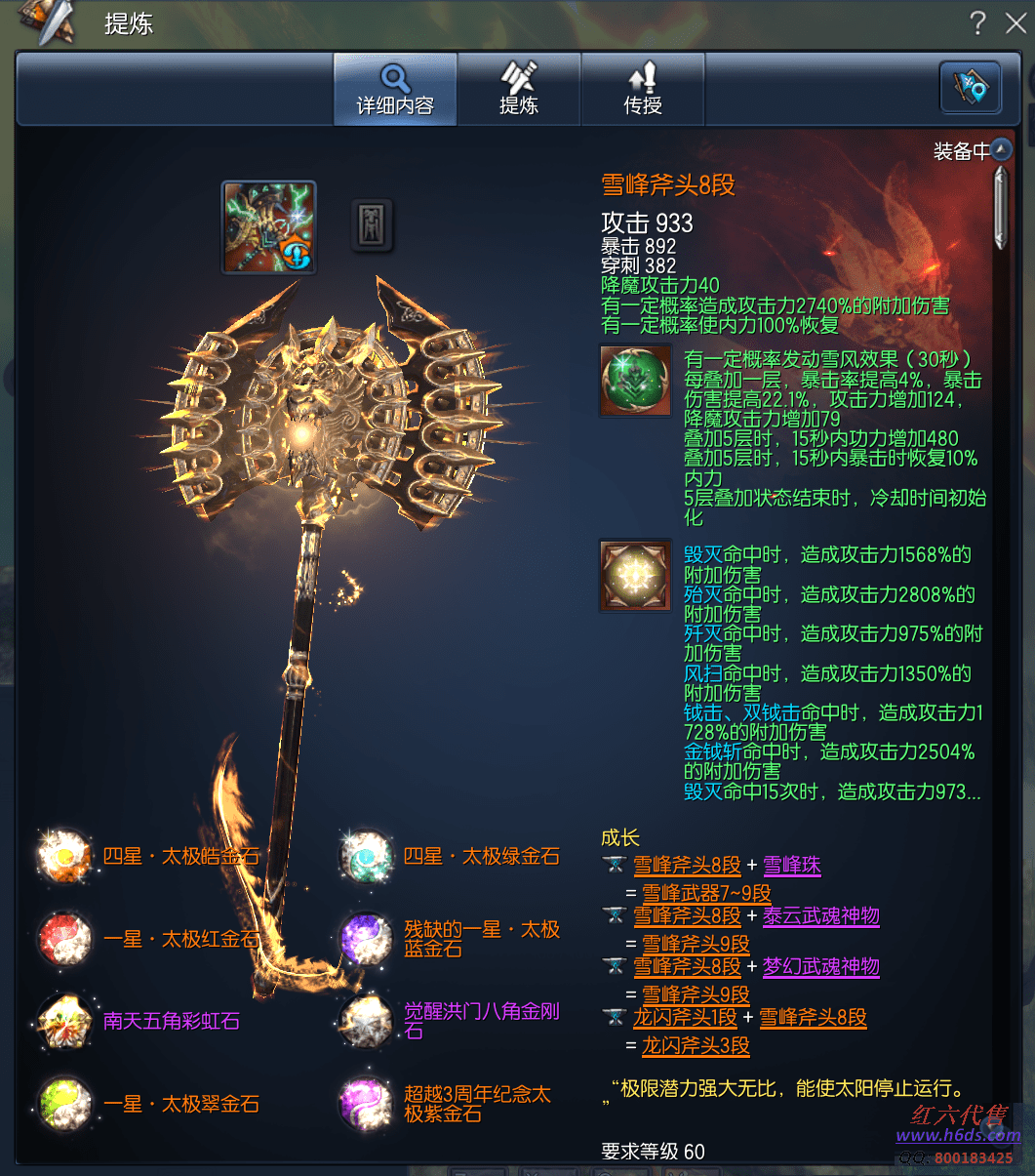 12650,铁魁王力士,侠义团75段,四星太极石x2,一星太极石x3,雪峰元气石11段,征伐真气石15段,雪峰斧头8段,卓越天目戒指3段,卓越邪花耳环3段,邪花项链10段,光雾手镯8段,狂天腰带1段,天佑手套8段,武乾神功牌8段,极花秘功牌8段,毁灭梦幻魂12段,凤凰灵1段,烬灭守护石1段,晨晖星11段,衣服40,《起手3000 稳定1500,备注元气石必成15神物已买好,梦幻星神物260个梦幻宝玉 280个》3200R,
