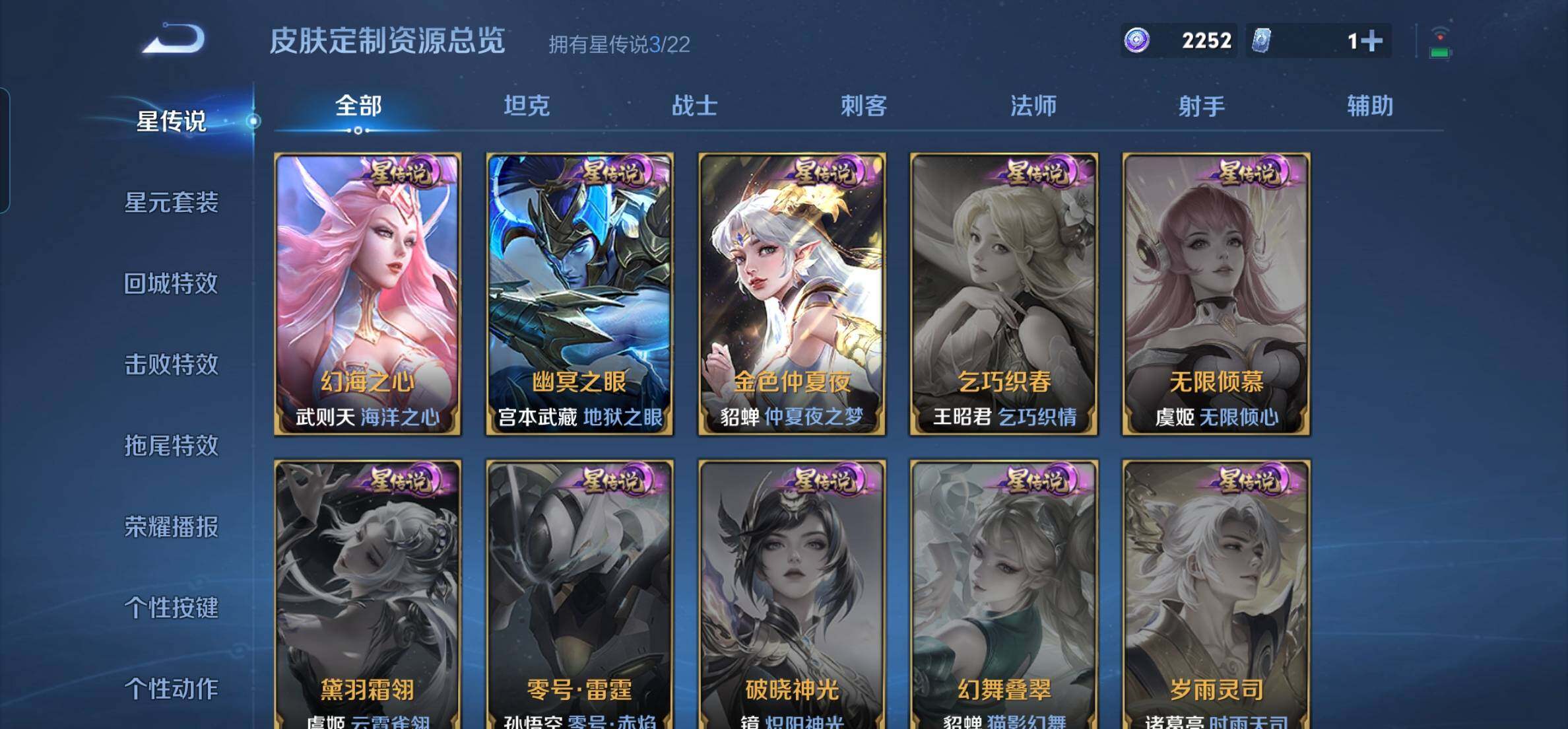 【传说皮肤】:后羿神树通天,云缨幻光神枪,虞姬启明星使,貂蝉仲夏夜之梦,宫本武藏地狱之眼,武则天海洋之心