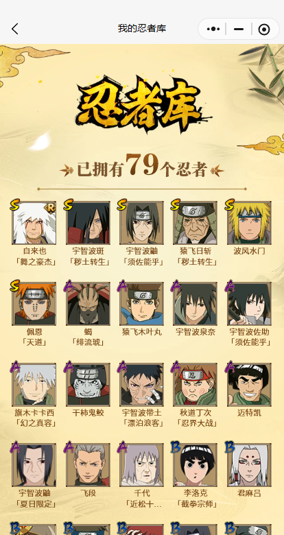 【S忍者】,自来也「舞之豪杰」,宇智波斑「秽土转生」,猿飞日斩「秽土转生」,宇智波鼬「须佐能乎」,佩恩「天道」,波风水门,