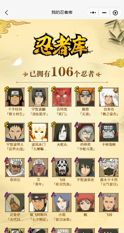 【A忍者】,宇智波泉奈,桃地再不斩「秽土转生」,艾「青年」,达鲁伊「五代目雷影」,波风水门「青年」,旗木卡卡西「元气夏日」,奇拉比「忍界大战」,猿飞阿斯玛「七夕限定」,旗木卡卡西「忍界大战」,宇智波带土「暴怒」,角都「晓创生」,千代「近松十人卫」,药师兜「半蛇斗篷」,我爱罗「忍界大战」,小南「夏日泳装」,秋道丁次「忍界大战」,大蛇丸「晓」,奇拉比,漩涡鸣人「仙人模式」,飞段「死司凭血」,飞段,我爱罗「疾风传」,蝎,干柿鬼鲛,迈特凯,
