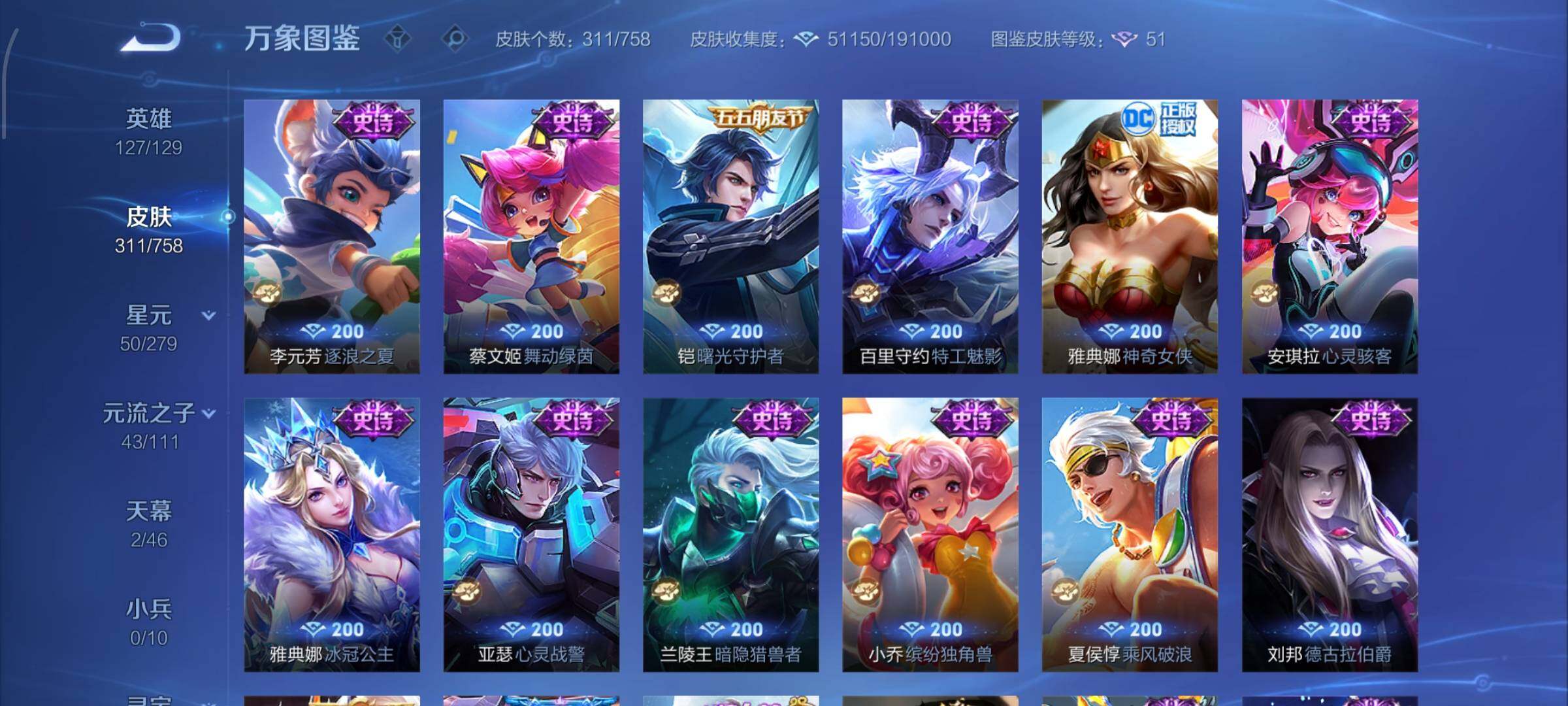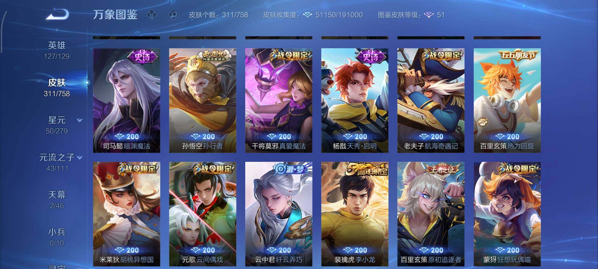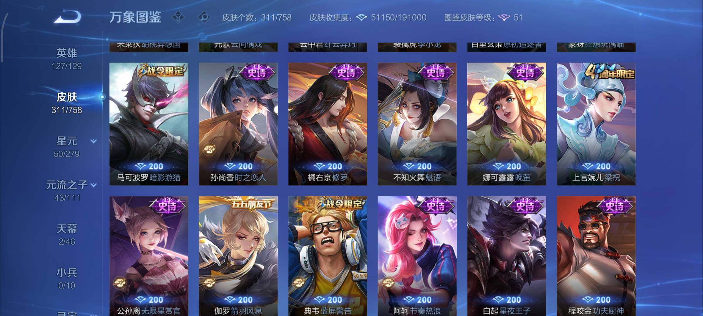 【史诗皮肤】:露娜紫霞仙子,阿轲暗夜猫娘,赵云皇家上将,赵云未来纪元,貂蝉圣诞恋歌,甄姬冰雪圆舞曲,王昭君偶像歌手,狄仁杰魔术师,宫本武藏鬼剑武藏,孙尚香蔷薇恋人,孙尚香水果甜心,嬴政暗夜贵公子,嬴政摇滚巨星,妲己魅力维加斯,妲己女仆咖啡,墨子金属风暴,吕布圣诞狂欢,刘禅绅士熊喵,曹操幽灵船长,李白千年之狐,吕布末日机甲,张飞乱世虎臣,孙悟空至尊宝,赵云引擎之心,花木兰水晶猎龙者,刘邦德古拉伯爵,夏侯惇乘风破浪,小乔缤纷独角兽,兰陵王暗隐猎兽者,亚瑟心灵战警,雅典娜冰冠公主,安琪拉心灵骇客,百里守约特工魅影,铠曙光守护者,蔡文姬舞动绿茵,李元芳逐浪之夏,程咬金功夫厨神,白起星夜王子,阿轲节奏热浪,典韦蓝屏警告,伽罗箭羽风息,狄仁杰鹰眼统帅,公孙离无限星赏官,上官婉儿梁祝,娜可露露晚萤,不知火舞魅语,橘右京修罗,孙尚香时之恋人,马可波罗暗影游猎,蒙犽狂想玩偶喵,百里玄策原初追逐者,裴擒虎李小龙,云中君纤云弄巧,元歌云间偶戏,米莱狄胡桃异想国,百里玄策热力回旋,老夫子航海奇遇记,杨戬天秀启明,干将莫邪真爱魔法,孙悟空孙行者,司马懿暗渊魔法,嫦娥拒霜思,黄忠火炮绅士,雅典娜黎明之约,韩信傲雪梅枪,夏洛特永昼,澜赏金猎手,明世隐吟游魔法,钟无艳超时空战士,鬼谷子五谷丰年,元歌无心,梦奇顽趣,妲己灵卜魔法,高渐离燃音魔法,姬小满妄想食味,鲁班七号蔬乡物语,大司命东方月初,百里守约百相守梦,牛魔星界战将,孙膑茶境仙,赵怀真器灵浮梦炉,阿轲化蝶舞,刘禅鸭鸭历险记,狂铁龙之律动,后羿石田雨龙,周瑜百相守梦,黄忠百相守梦,公孙离涂山容容,莱西奥光弋星穹,兰陵王傩神司,少司缘巫礼祀神
