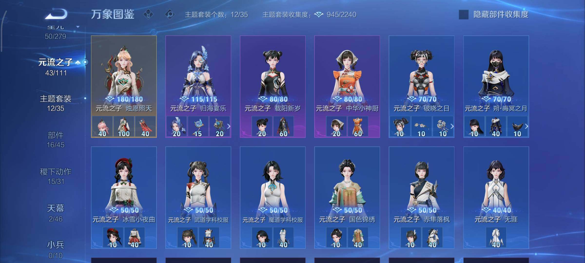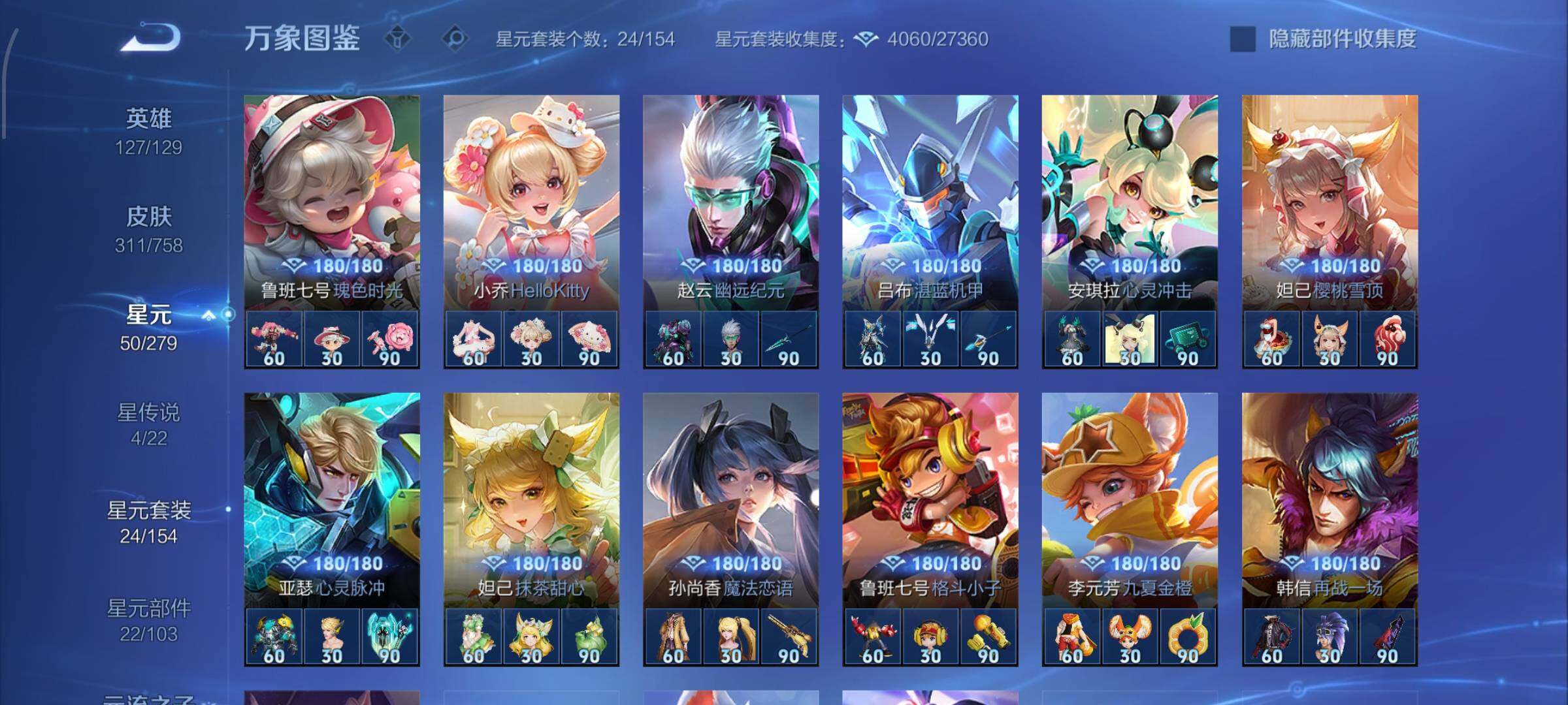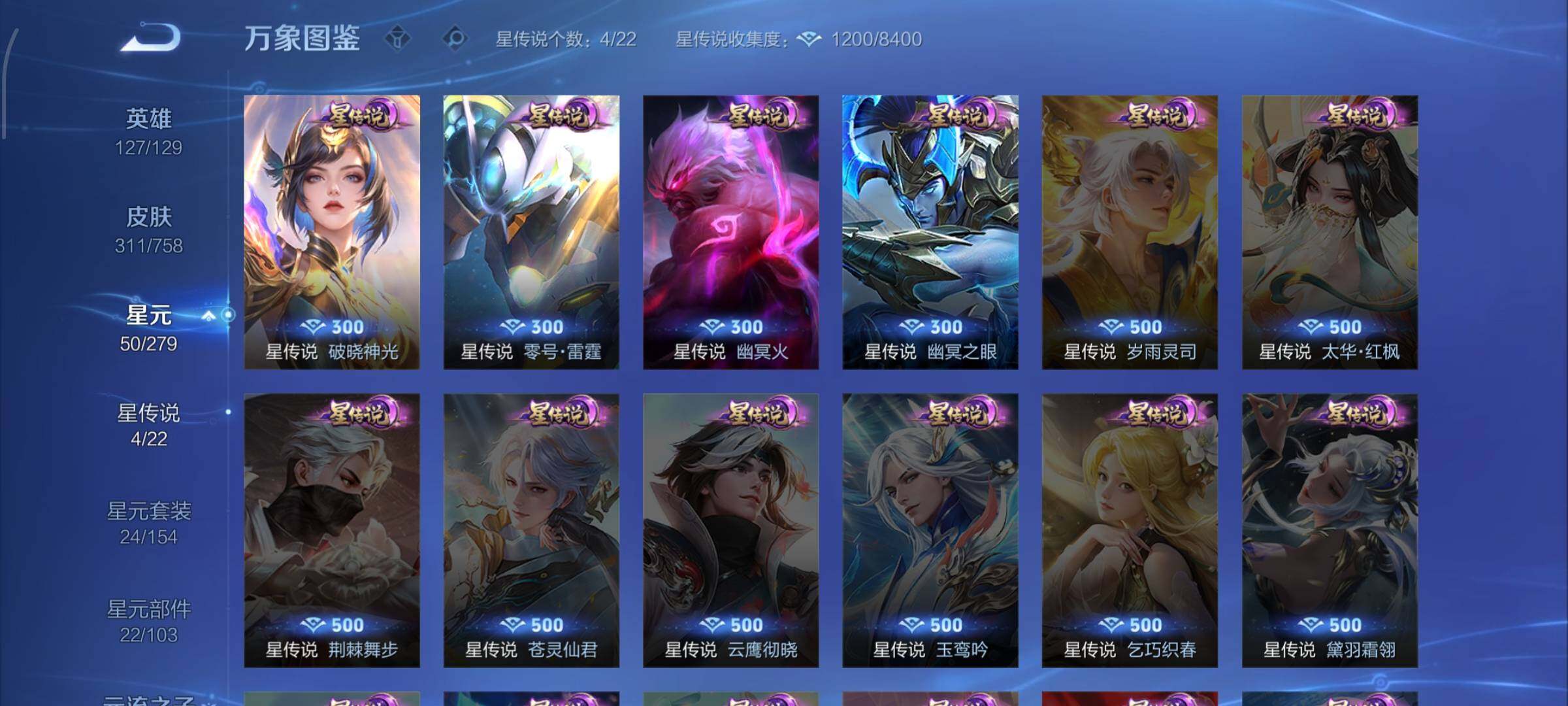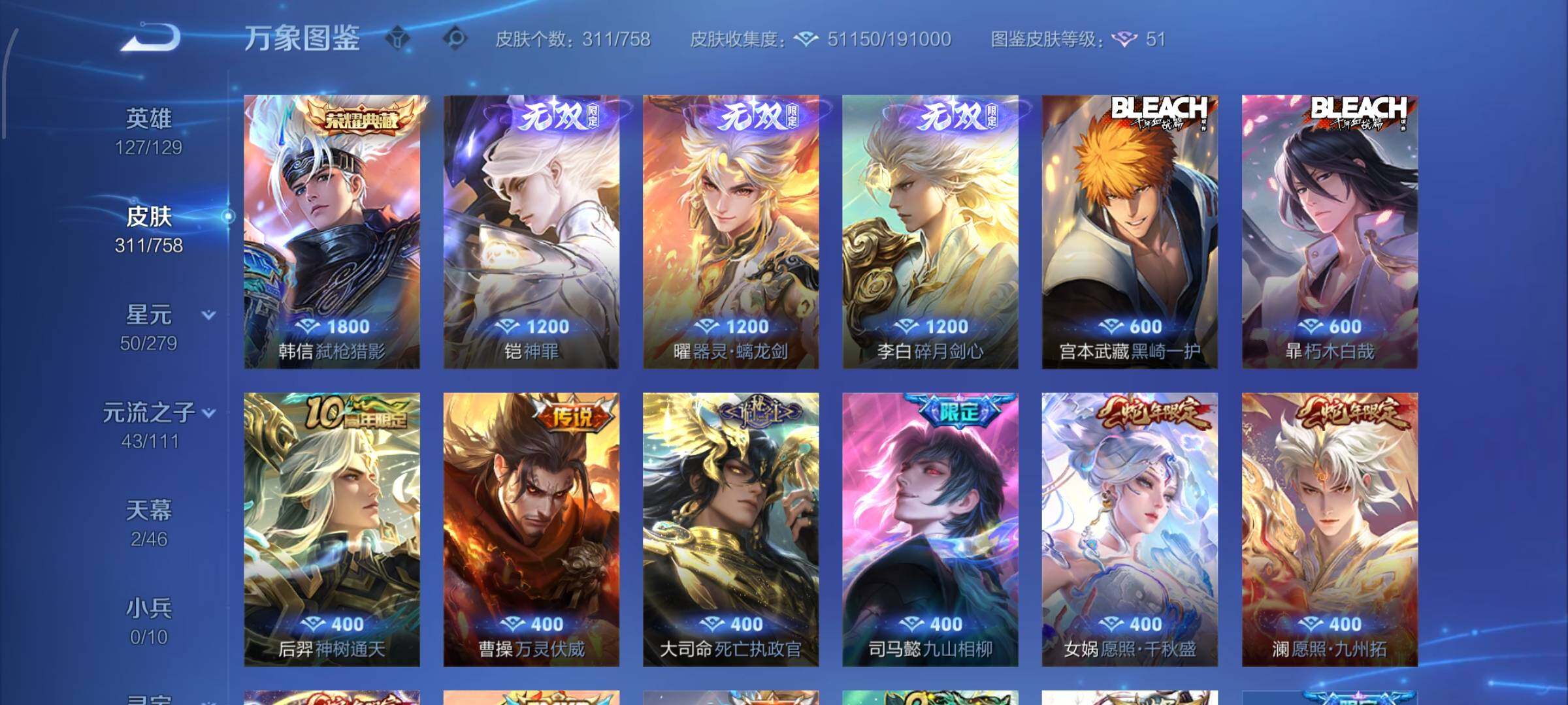 【史诗皮肤】:露娜紫霞仙子,阿轲暗夜猫娘,赵云皇家上将,赵云未来纪元,貂蝉圣诞恋歌,甄姬冰雪圆舞曲,王昭君偶像歌手,狄仁杰魔术师,宫本武藏鬼剑武藏,孙尚香蔷薇恋人,孙尚香水果甜心,嬴政暗夜贵公子,嬴政摇滚巨星,妲己魅力维加斯,妲己女仆咖啡,墨子金属风暴,吕布圣诞狂欢,刘禅绅士熊喵,曹操幽灵船长,李白千年之狐,吕布末日机甲,张飞乱世虎臣,孙悟空至尊宝,赵云引擎之心,花木兰水晶猎龙者,刘邦德古拉伯爵,夏侯惇乘风破浪,小乔缤纷独角兽,兰陵王暗隐猎兽者,亚瑟心灵战警,雅典娜冰冠公主,安琪拉心灵骇客,百里守约特工魅影,铠曙光守护者,蔡文姬舞动绿茵,李元芳逐浪之夏,程咬金功夫厨神,白起星夜王子,阿轲节奏热浪,典韦蓝屏警告,伽罗箭羽风息,狄仁杰鹰眼统帅,公孙离无限星赏官,上官婉儿梁祝,娜可露露晚萤,不知火舞魅语,橘右京修罗,孙尚香时之恋人,马可波罗暗影游猎,蒙犽狂想玩偶喵,百里玄策原初追逐者,裴擒虎李小龙,云中君纤云弄巧,元歌云间偶戏,米莱狄胡桃异想国,百里玄策热力回旋,老夫子航海奇遇记,杨戬天秀启明,干将莫邪真爱魔法,孙悟空孙行者,司马懿暗渊魔法,嫦娥拒霜思,黄忠火炮绅士,雅典娜黎明之约,韩信傲雪梅枪,夏洛特永昼,澜赏金猎手,明世隐吟游魔法,钟无艳超时空战士,鬼谷子五谷丰年,元歌无心,梦奇顽趣,妲己灵卜魔法,高渐离燃音魔法,姬小满妄想食味,鲁班七号蔬乡物语,大司命东方月初,百里守约百相守梦,牛魔星界战将,孙膑茶境仙,赵怀真器灵浮梦炉,阿轲化蝶舞,刘禅鸭鸭历险记,狂铁龙之律动,后羿石田雨龙,周瑜百相守梦,黄忠百相守梦,公孙离涂山容容,莱西奥光弋星穹,兰陵王傩神司,少司缘巫礼祀神