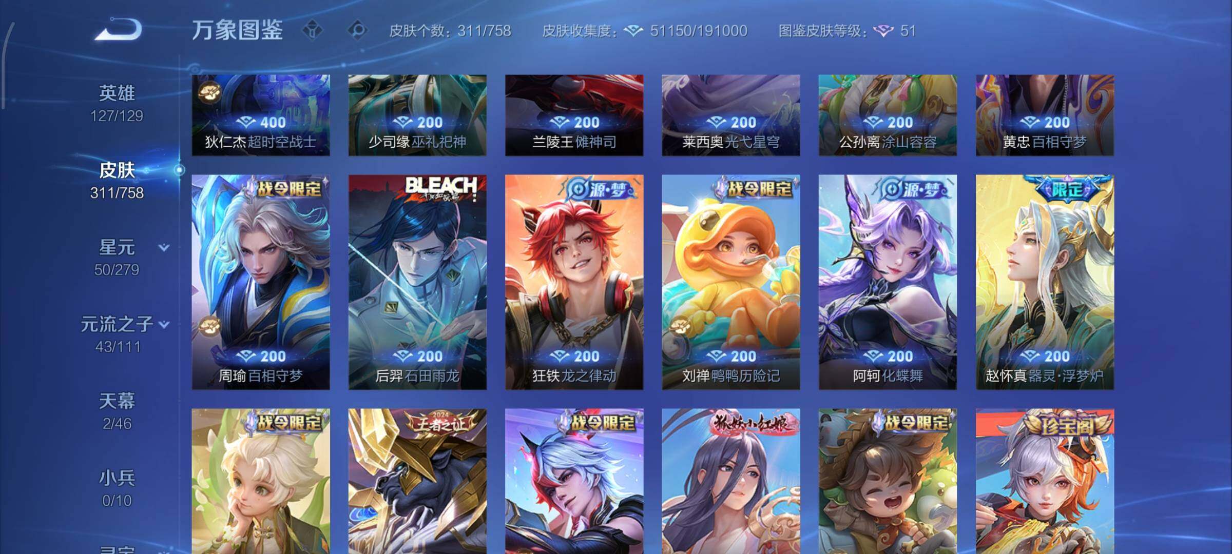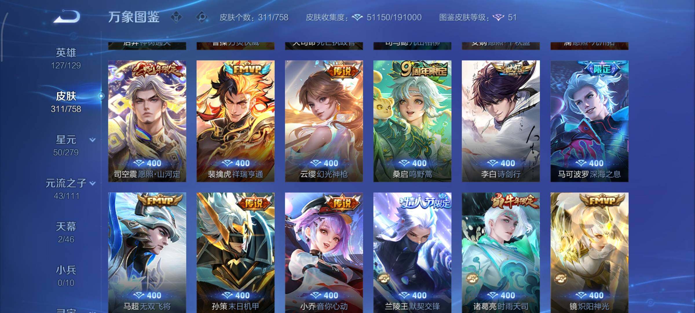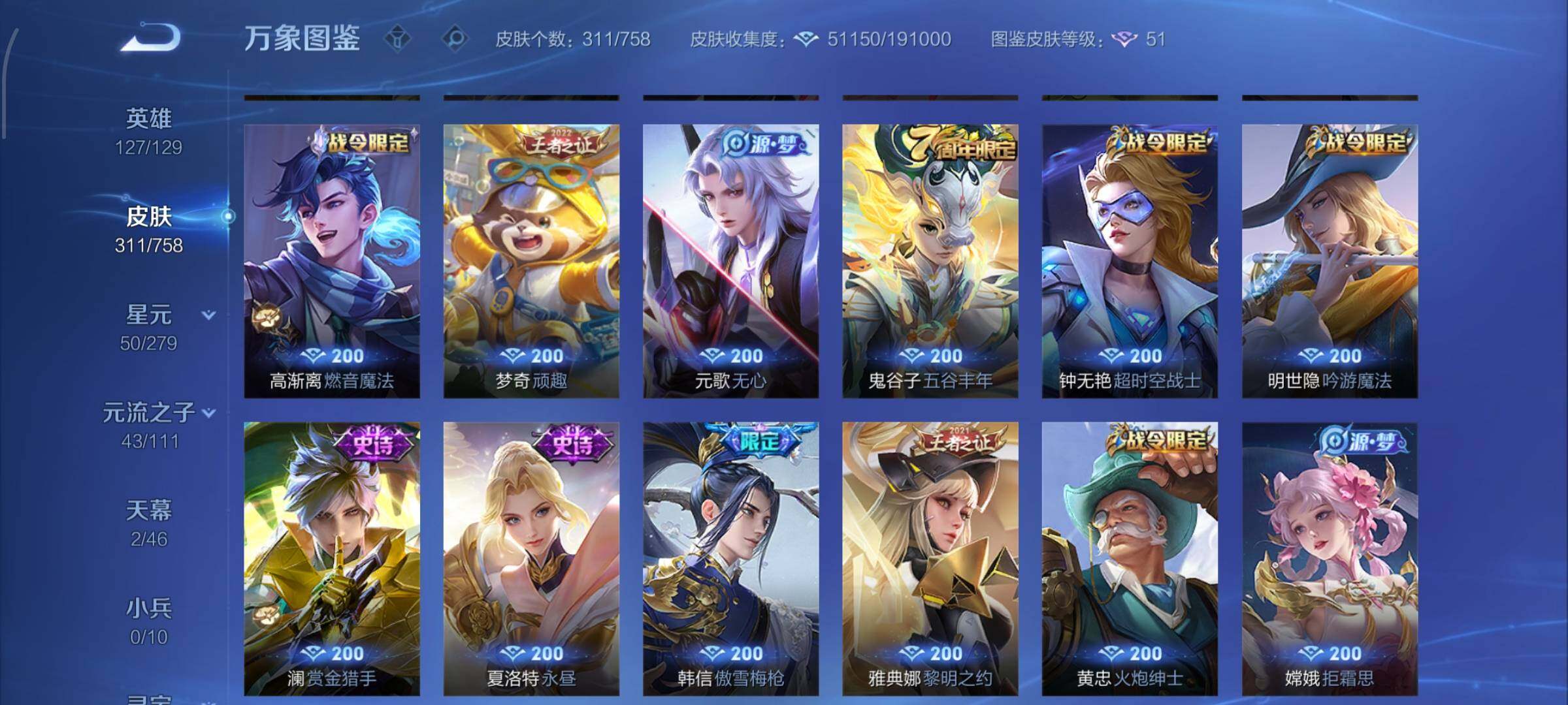 【战令限定】:墨子神迹守卫,虞姬夏日便利店,钟无艳超时空战士,白起夜都怪侠,芈月幻夜卜梦,元歌云间偶戏,甄姬落雪兰心,典韦蓝屏警告,马可波罗暗影游猎,达摩星际陆战队,老夫子航海奇遇记,亚瑟潮玩骑士王,后羿圣弓游侠,杨戬潮玩骑兵,干将莫邪真爱魔法,雅典娜单词大作战,黄忠火炮绅士,明世隐吟游魔法,米莱狄胡桃异想国,猪八戒西部大镖客,嫦娥暖冬兔眠,蒙犽狂想玩偶喵,高渐离燃音魔法,妲己灵卜魔法,鲁班七号蔬乡物语,李元芳蔬乡物语,项羽苍威无极