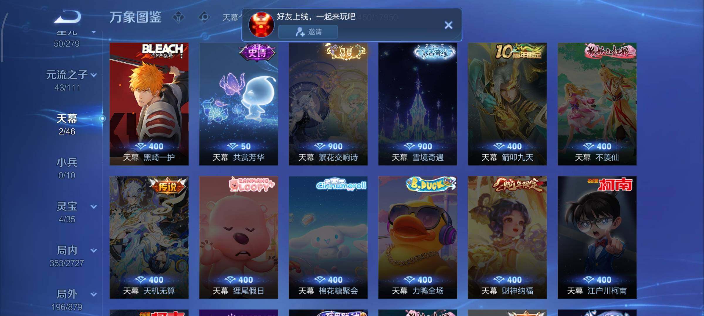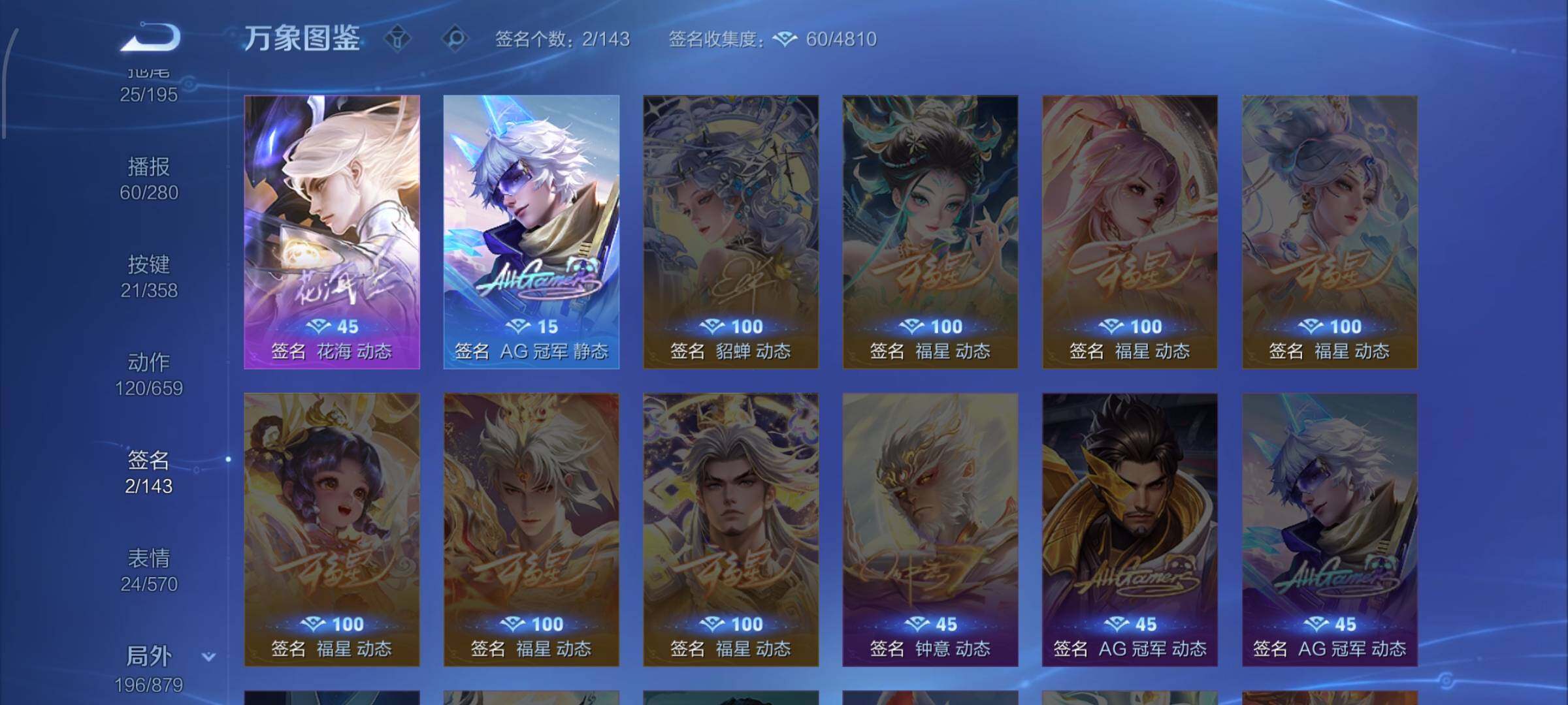 【赛季限定】:狄仁杰万华元夜,达摩沙漠行僧,老夫子醍醐杖,程咬金演武夺筹,兰陵王金庭之子,张良古海寻踪,李元芳云中旅人,钟馗驱傩正仪,雅典娜黎明之约,鬼谷子原初探秘者,苏烈千军破阵,百里玄策原初追逐者,弈星混沌棋,梦奇顽趣,沈梦溪大漠名商,明世隐疑决卦,裴擒虎擒涛扼浪,盾山御銮,鲁班大师探海日志,桑启海盐诗旅,鬼谷子天穹祈灯,刘邦剑破天穹,姜子牙天穹之誓