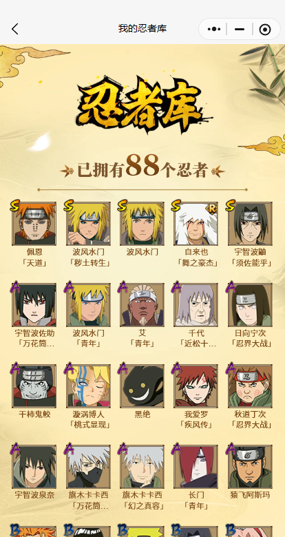 【A忍者】,日向宁次「忍界大战」,漩涡博人「桃式显现」,旗木卡卡西「幻之真容」,黑绝,宇智波泉奈,长门「青年」,艾「青年」,波风水门「青年」,千代「近松十人卫」,秋道丁次「忍界大战」,宇智波佐助「万花筒写轮眼」,旗木卡卡西「万花筒写轮眼」,我爱罗「疾风传」,干柿鬼鲛,猿飞阿斯玛,