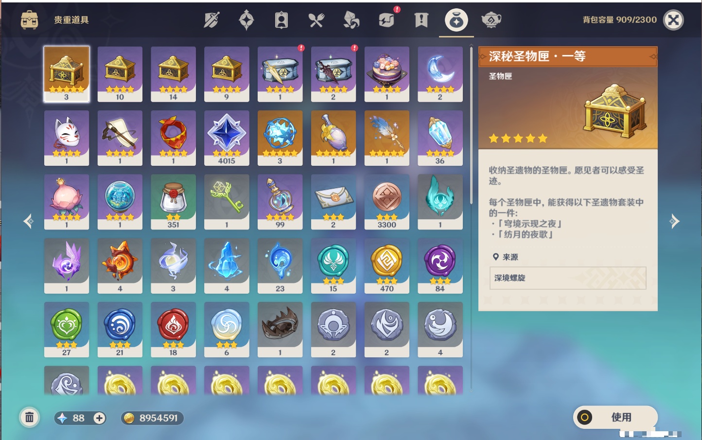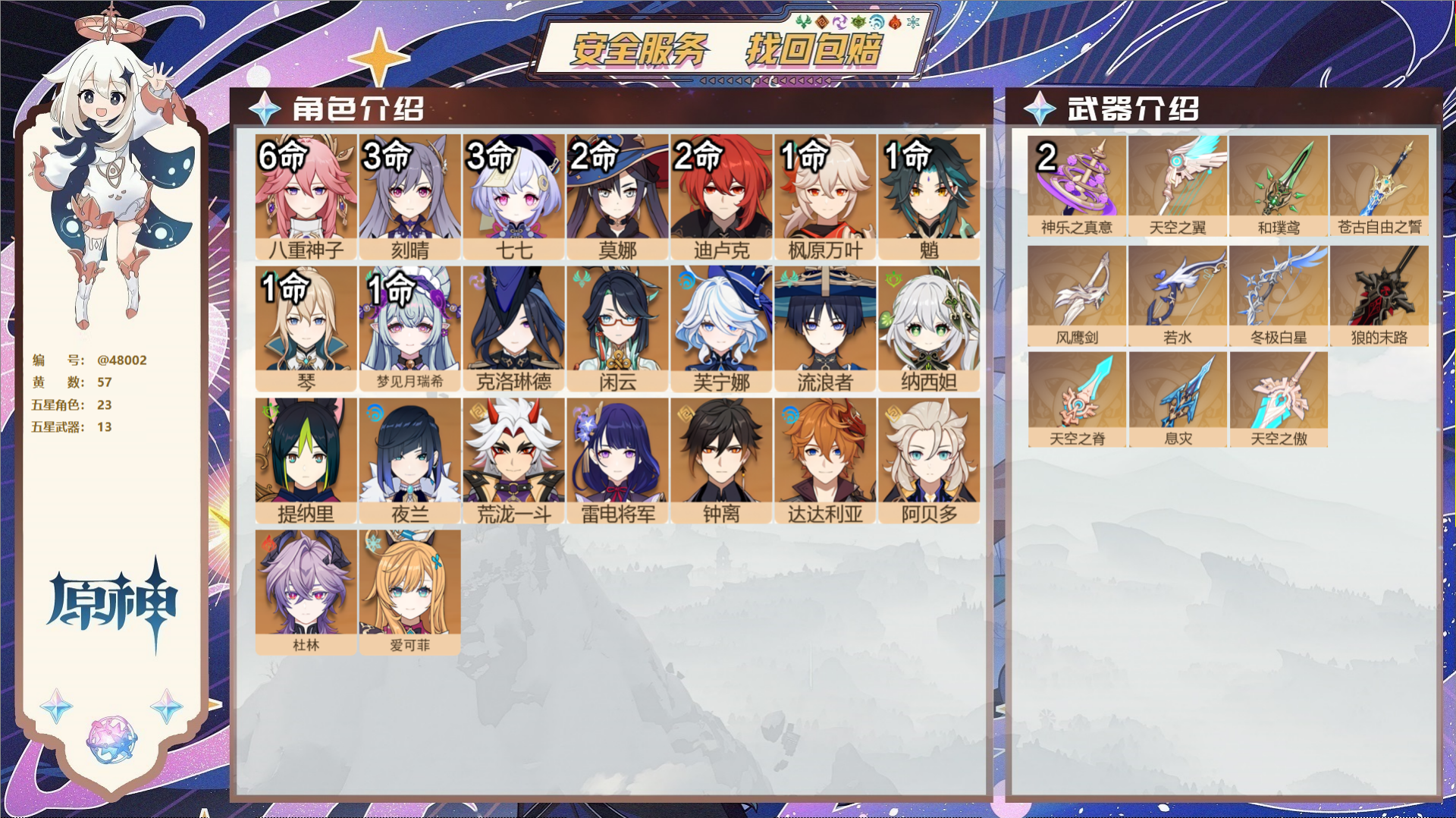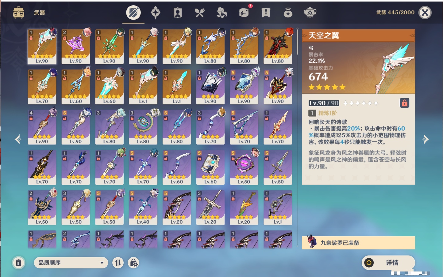 【13个五星武器】,精2神乐之真意,精1天空之翼,精1和璞鸢,精1苍古自由之誓,精1风鹰剑,精1若水,精1冬极白星,精1狼的末路,精1天空之脊,精1息灾,精1天空之傲,