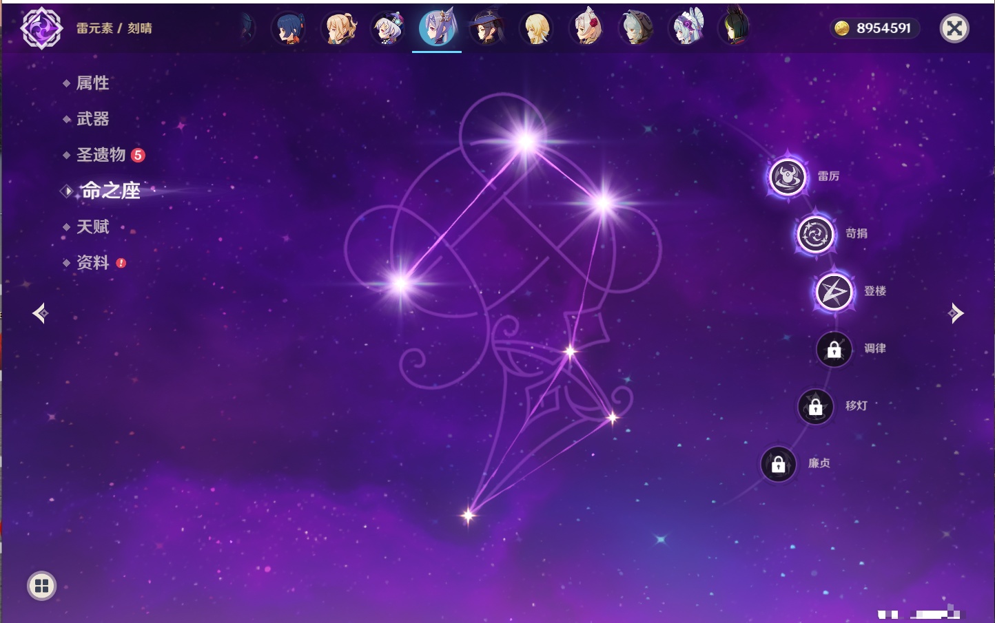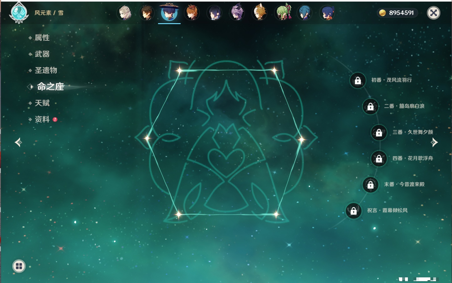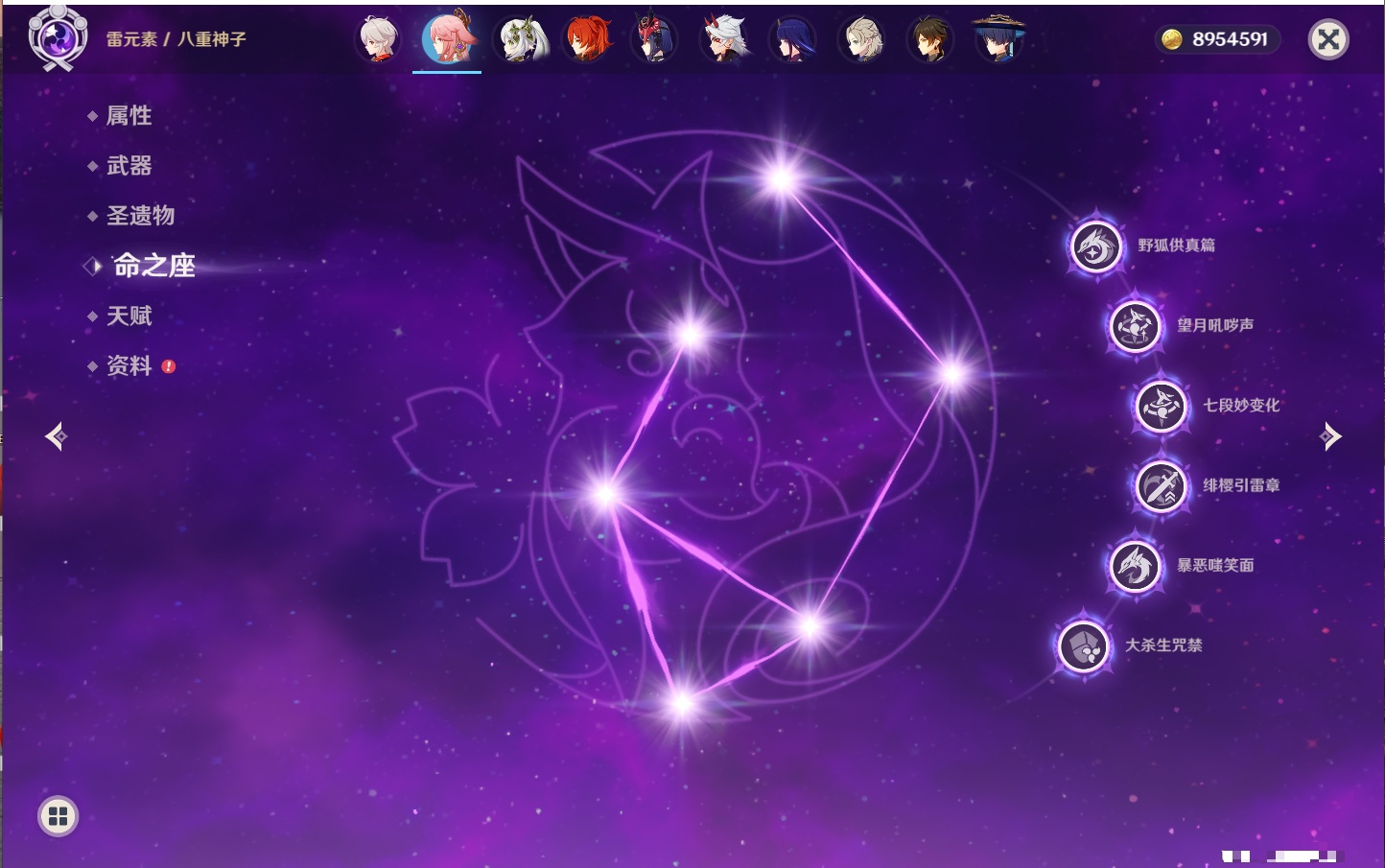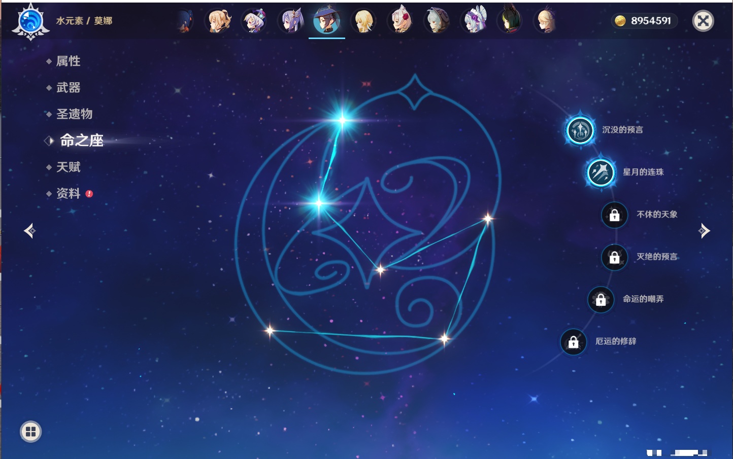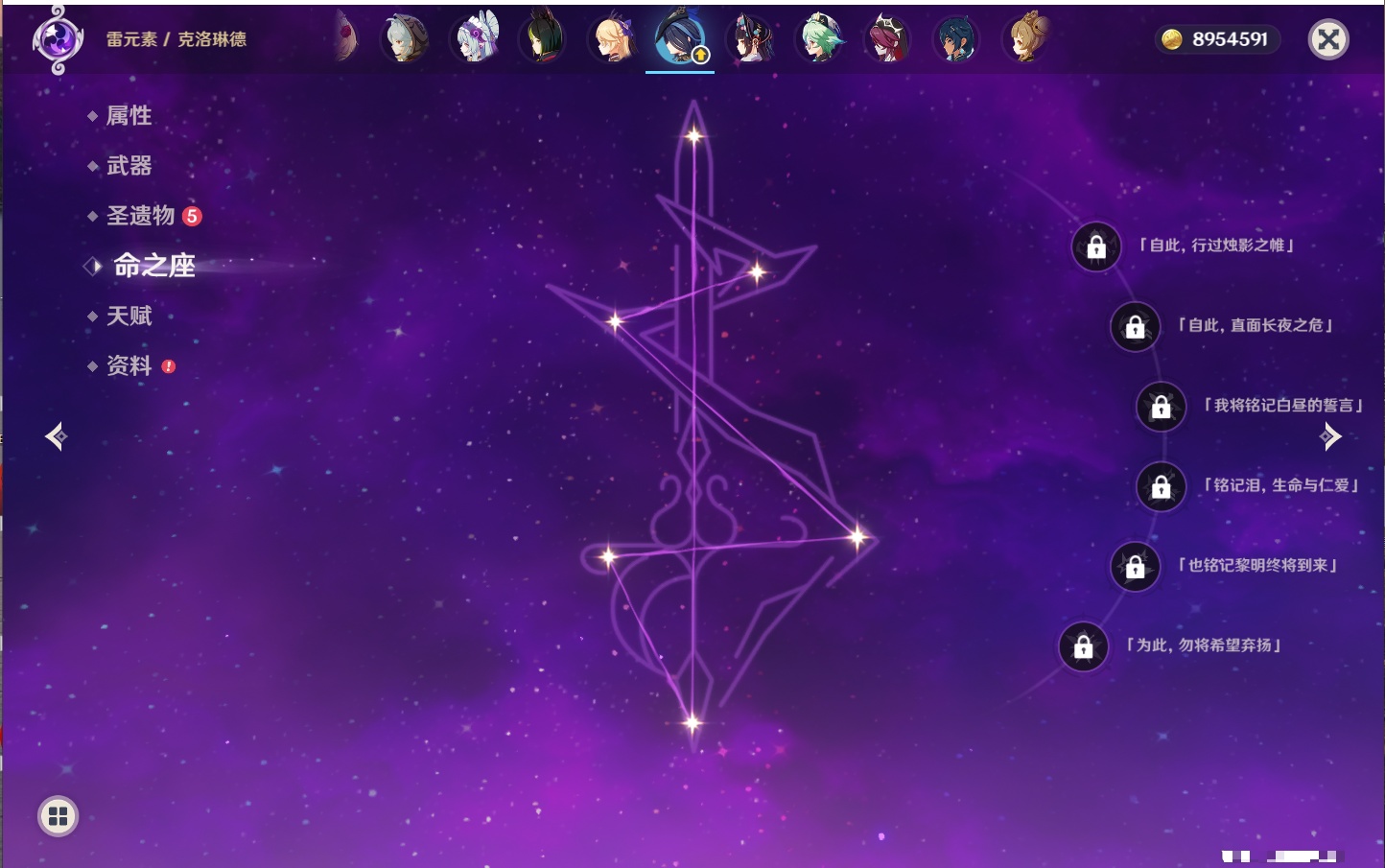【23个五星角色】,满命八重神子,3命刻晴,3命七七,2命莫娜,2命迪卢克,1命枫原万叶,1命魈,1命琴,1命梦见月瑞希,0命克洛琳德,0命闲云,0命芙宁娜,0命流浪者,0命纳西妲,0命提纳里,0命夜兰,0命荒泷一斗,0命雷电将军,0命钟离,0命达达利亚,0命阿贝多,0命杜林,0命爱可菲,