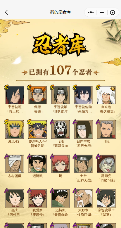 【A忍者】,机械鸣人「初始形态」,大野木「侠隐江湖」,迈特凯「青春爆炸」,土台「忍界大战」,日向宁次「忍界大战」,漩涡博人「桃式显现」,宇智波泉奈,桃地再不斩「秽土转生」,宇智波带土「暴怒」,千代「近松十人卫」,药师兜「半蛇斗篷」,志村团藏,飞段「死司凭血」,飞段,我爱罗「疾风传」,蝎,干柿鬼鲛,猿飞阿斯玛,迈特凯,