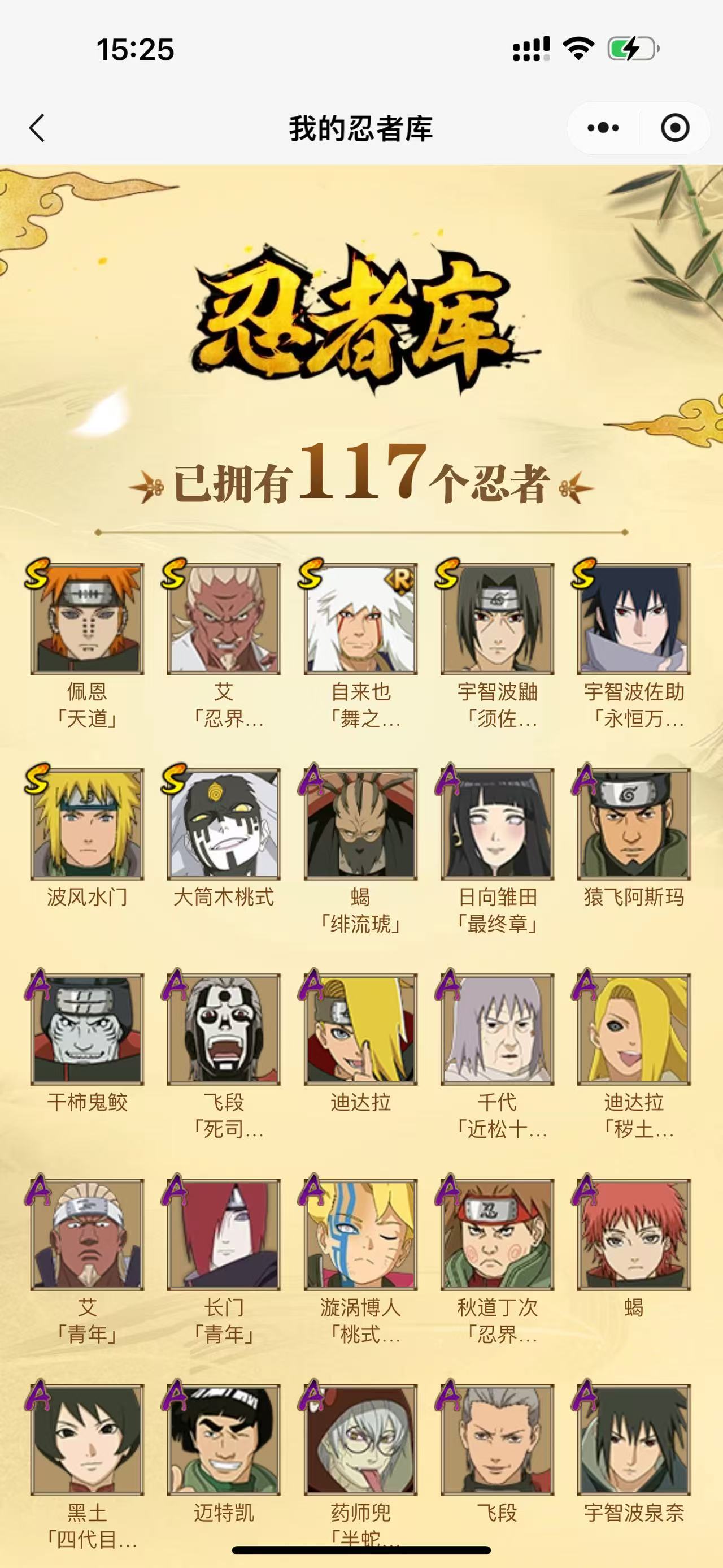 【A忍者】,漩涡博人「桃式显现」,日向雏田「最终章」,李洛克「忍界大战」,蝎「绯流琥」,宇智波泉奈,长门「青年」,艾「青年」,波风水门「青年」,宇智波佐助「须佐能乎」,迪达拉「秽土转生」,千代「近松十人卫」,药师兜「半蛇斗篷」,秋道丁次「忍界大战」,宇智波佐助「万花筒写轮眼」,飞段「死司凭血」,飞段,迪达拉,我爱罗「疾风传」,蝎,干柿鬼鲛,宇智波鼬,猿飞阿斯玛,迈特凯,