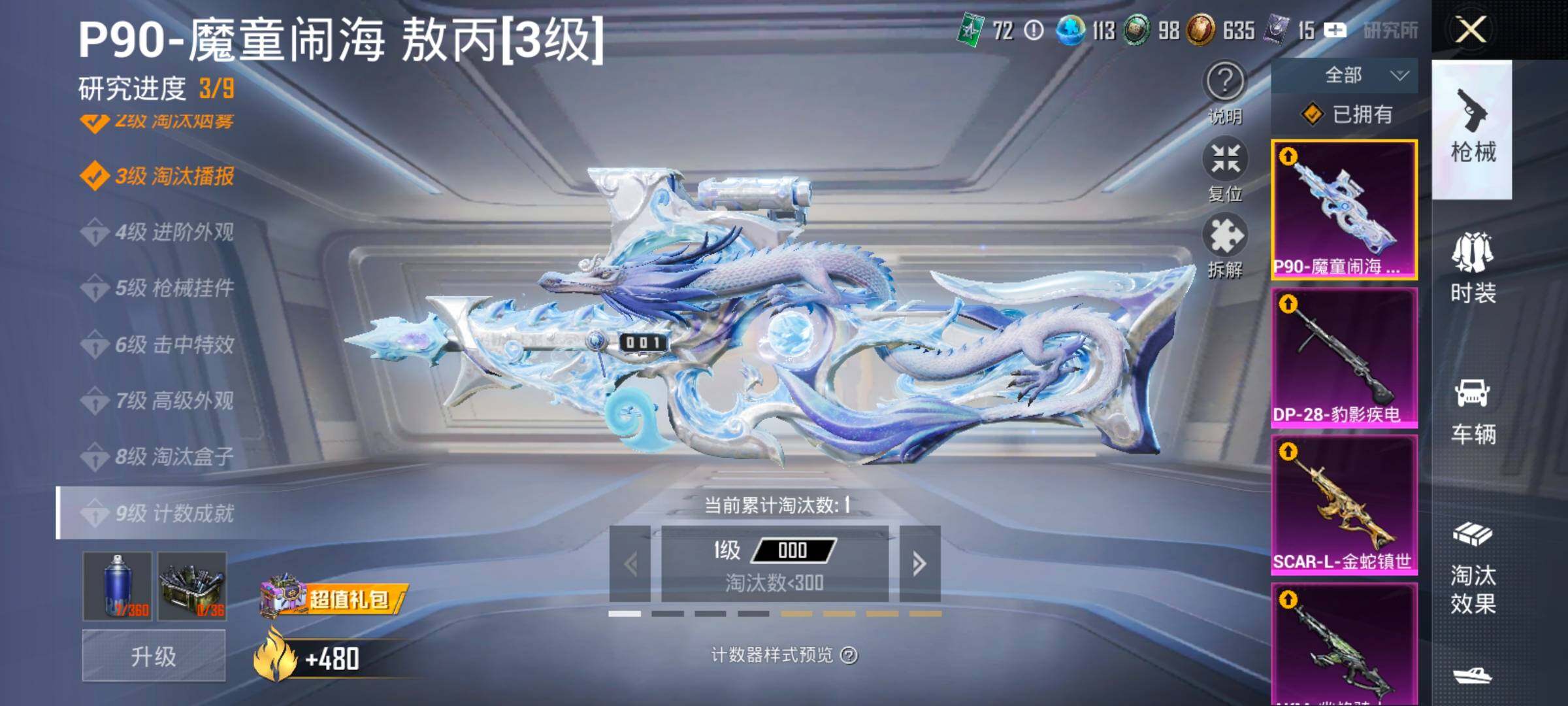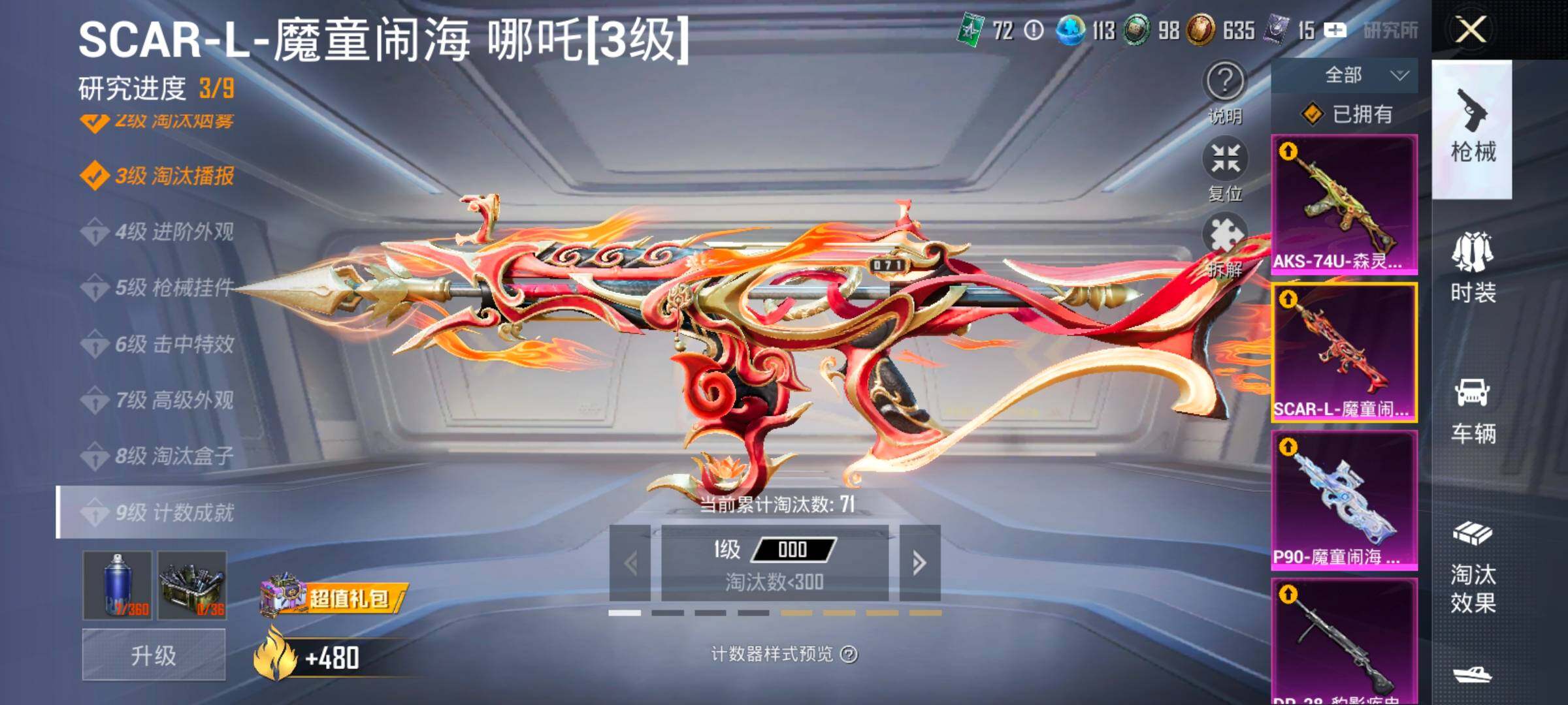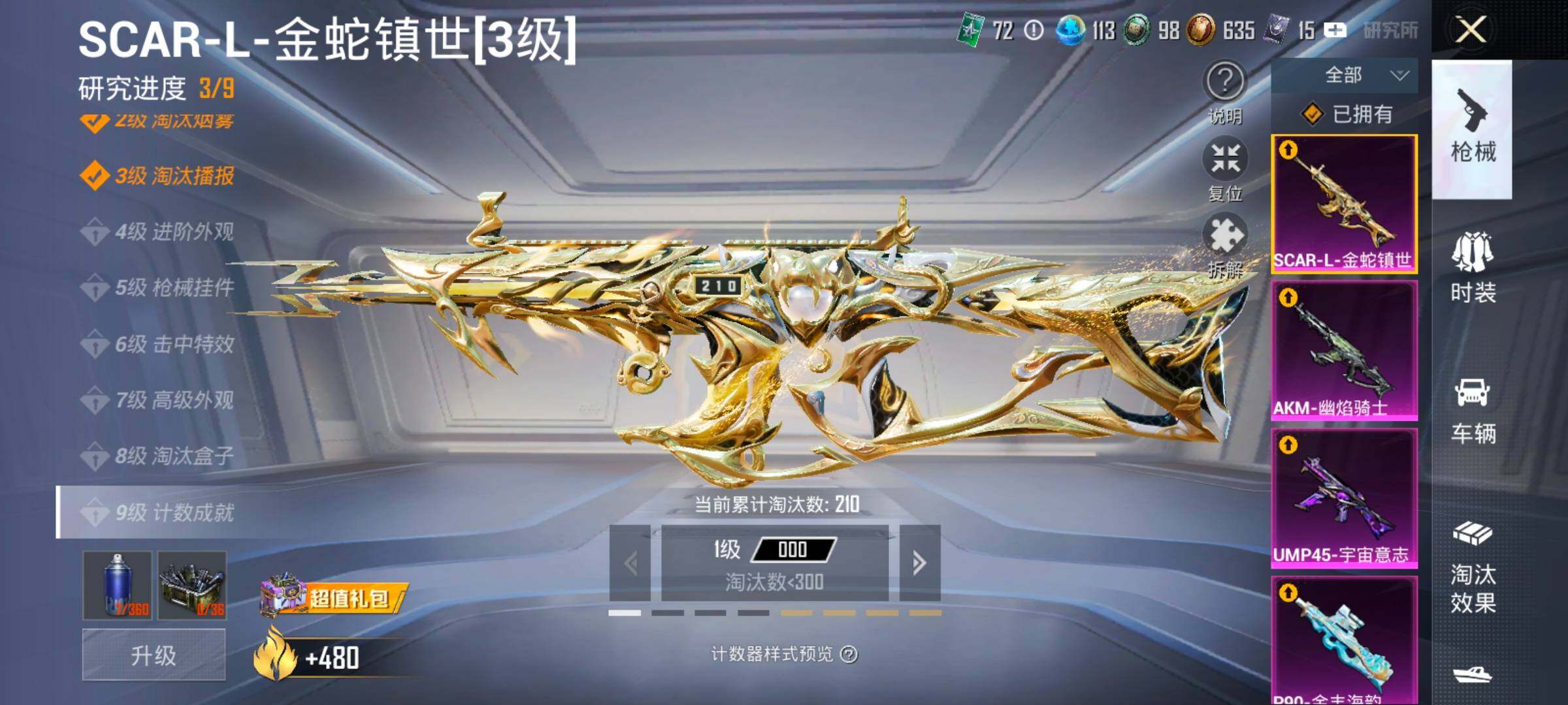 【9特效枪】,SCAR-L-金蛇镇世,(3级),P90-魔童闹海敖丙,(3级),SCAR-L-魔童闹海哪吒,(3级),P90-金丰海韵,(3级),AKM-幽焰骑士,(3级),AKS-74U-森灵之息,(4级),UMP45-宇宙意志,(3级),DP-28-豹影疾电,(4级),AUG-星梦奇缘,(3级),