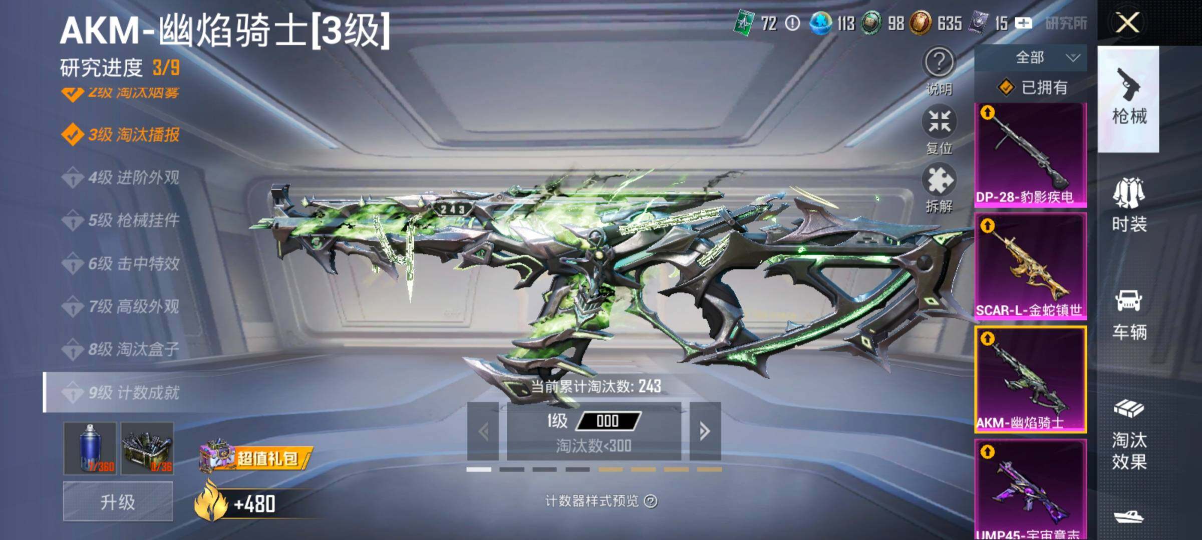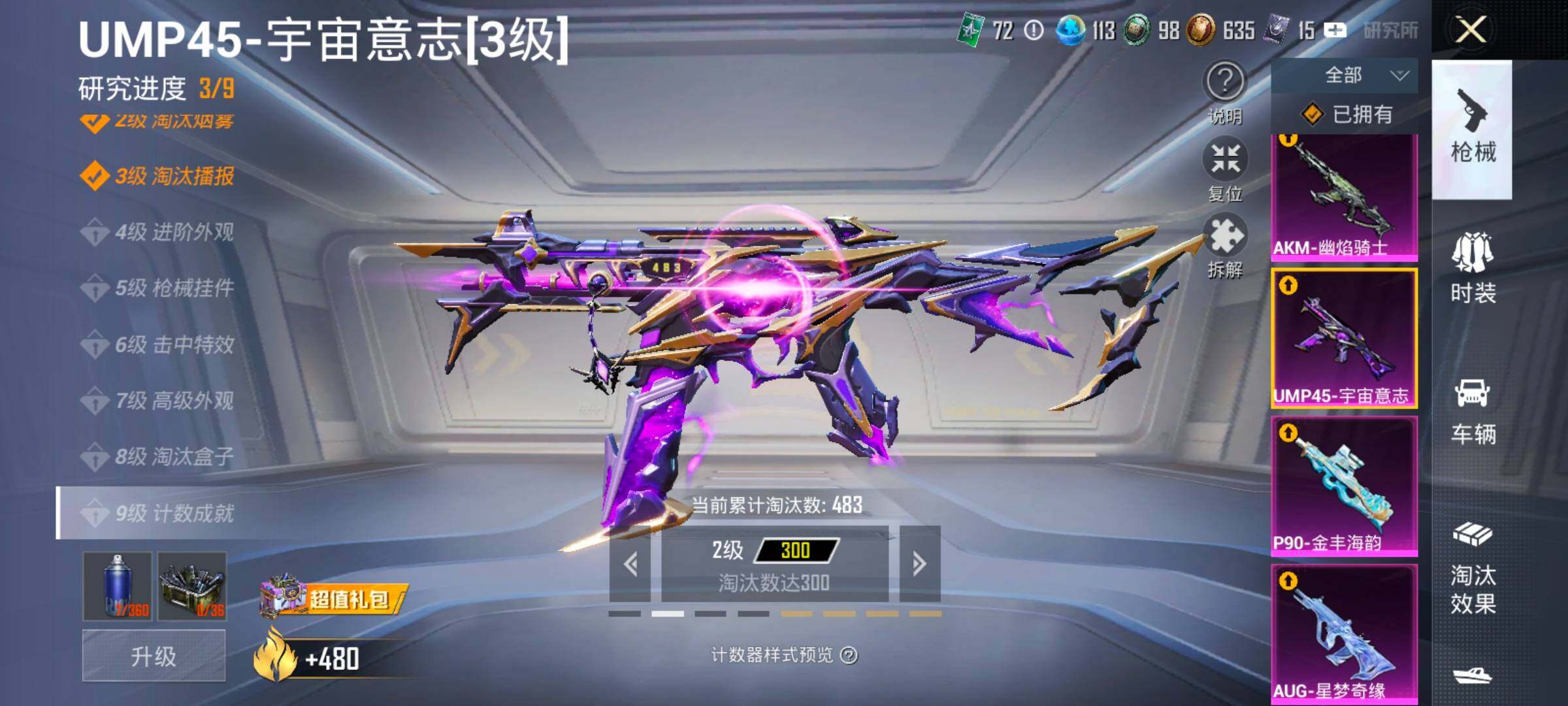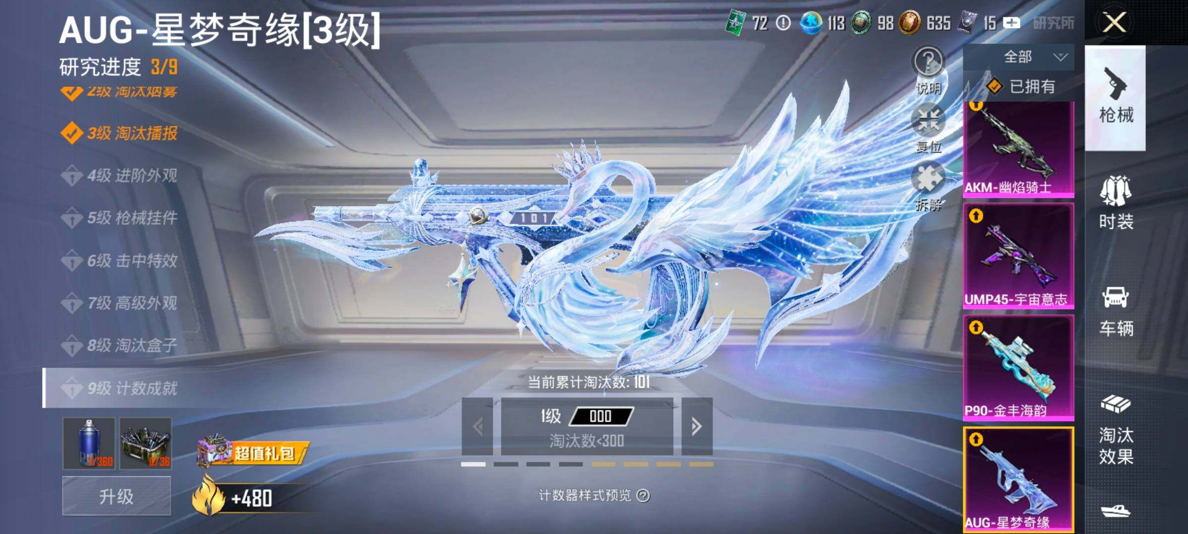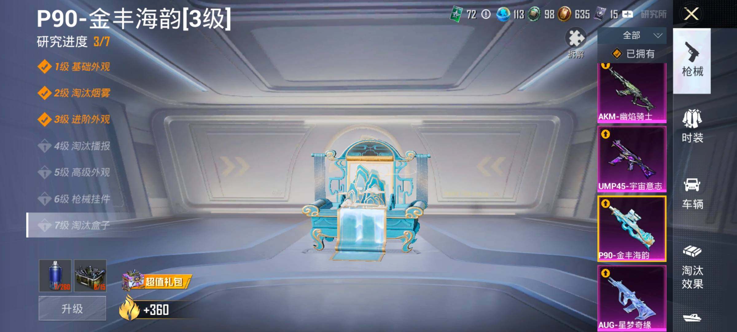 【9特效枪】,SCAR-L-金蛇镇世,(3级),P90-魔童闹海敖丙,(3级),SCAR-L-魔童闹海哪吒,(3级),P90-金丰海韵,(3级),AKM-幽焰骑士,(3级),AKS-74U-森灵之息,(4级),UMP45-宇宙意志,(3级),DP-28-豹影疾电,(4级),AUG-星梦奇缘,(3级),