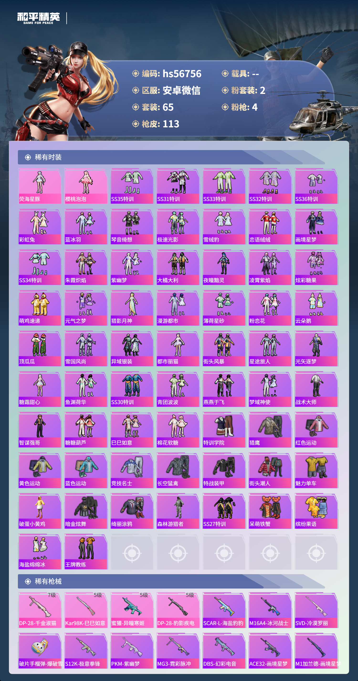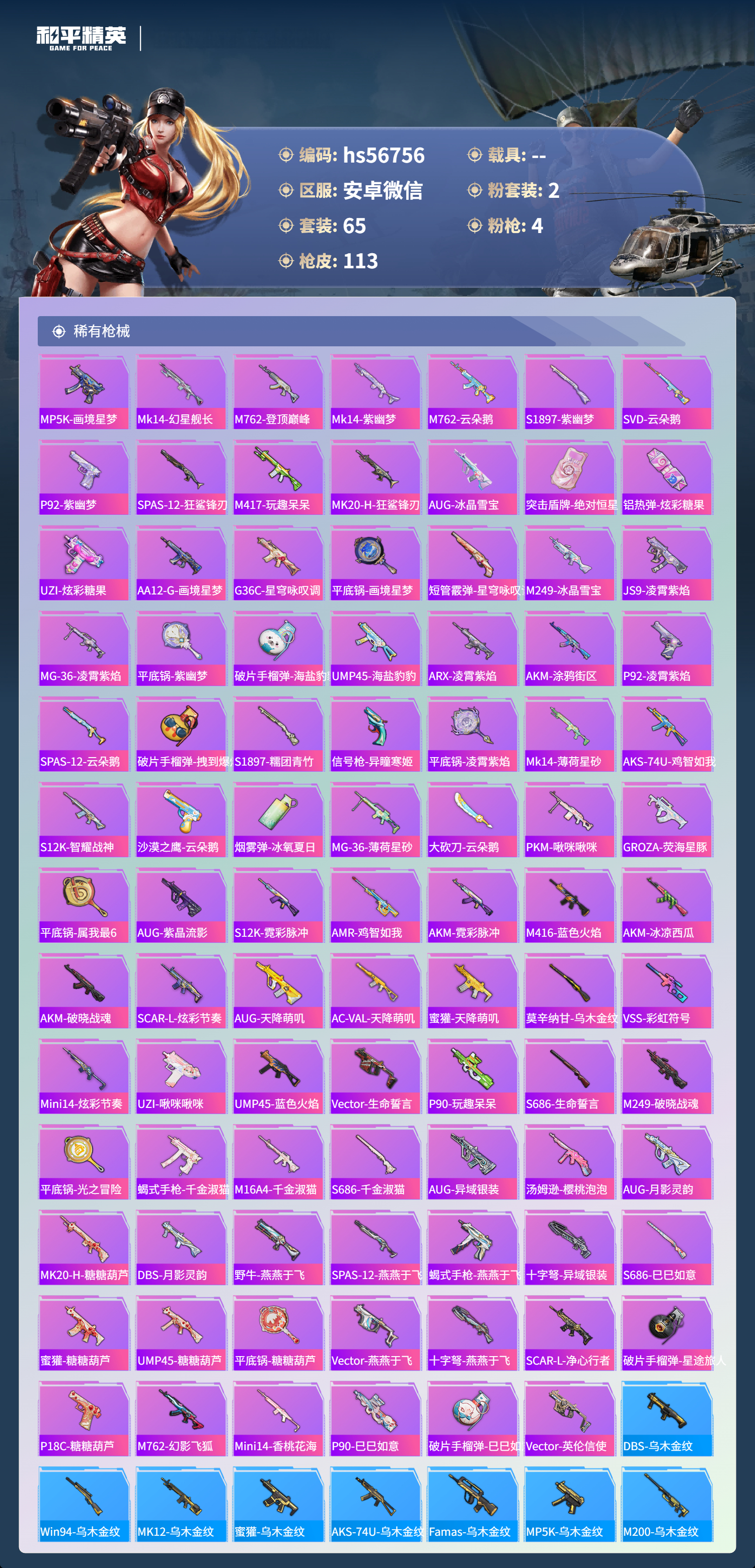 【113稀有枪械】DBS-乌木金纹,SCAR-L-海盐豹豹,DP-28-千金淑猫/7级,Kar98K-巳巳如意/5级,蜜獾-异瞳寒姬/5级,DP-28-豹影疾电/5级,M16A4-冰河战士,Win94-乌木金纹,MK12-乌木金纹,SVD-冷漠罗丽,破片手榴弹-爆破雪人,S12K-极意拳锋,PKM-紫幽梦,MG3-霓彩脉冲,DBS-幻彩电音,ACE32-画境星梦,M1加兰德-画境星梦,MP5K-画境星梦,Mk14-幻星舰长,M762-登顶巅峰,Mk14-紫幽梦,蜜獾-乌木金纹,M762-云朵鹅,S1897-紫幽梦,SVD-云朵鹅,P92-紫幽梦,SPAS-12-狂鲨锋刃,M417-玩趣呆呆,MK20-H-狂鲨锋刃,AUG-冰晶雪宝,突击盾牌-绝对恒星,铝热弹-炫彩糖果,UZI-炫彩糖果,AA12-G-画境星梦,G36C-星穹咏叹调,平底锅-画境星梦,短管霰弹-星穹咏叹调,M249-冰晶雪宝,JS9-凌霄紫焰,MG-36-凌霄紫焰,平底锅-紫幽梦,破片手榴弹-海盐豹豹,UMP45-海盐豹豹,ARX-凌霄紫焰,AKS-74U-乌木金纹,AKM-涂鸦街区,P92-凌霄紫焰,Famas-乌木金纹,SPAS-12-云朵鹅,破片手榴弹-拽到爆炸,S1897-糯团青竹,信号枪-异瞳寒姬,平底锅-凌霄紫焰,Mk14-薄荷星砂,AKS-74U-鸡智如我,S12K-智耀战神,沙漠之鹰-云朵鹅,烟雾弹-冰氧夏日,MG-36-薄荷星砂,大砍刀-云朵鹅,PKM-啾咪啾咪,GROZA-荧海星豚,平底锅-属我最6,AUG-紫晶流影,S12K-霓彩脉冲,AMR-鸡智如我,AKM-霓彩脉冲,M416-蓝色火焰,AKM-冰凉西瓜,AKM-破晓战魂,SCAR-L-炫彩节奏,AUG-天降萌叽,AC-VAL-天降萌叽,蜜獾-天降萌叽,莫辛纳甘-乌木金纹,VSS-彩虹符号,Mini14-炫彩节奏,UZI-啾咪啾咪,UMP45-蓝色火焰,Vector-生命誓言,MP5K-乌木金纹,P90-玩趣呆呆,S686-生命誓言,M249-破晓战魂,平底锅-光之冒险,蝎式手枪-千金淑猫,M16A4-千金淑猫,S686-千金淑猫,AUG-异域银装,汤姆逊-樱桃泡泡,AUG-月影灵韵,MK20-H-糖糖葫芦,DBS-月影灵韵,野牛-燕燕于飞,M200-乌木金纹,SPAS-12-燕燕于飞,蝎式手枪-燕燕于飞,十字弩-异域银装,S686-巳巳如意,蜜獾-糖糖葫芦,UMP45-糖糖葫芦,SPAS-12-乌木金纹,平底锅-糖糖葫芦,Vector-燕燕于飞,十字弩-燕燕于飞,SCAR-L-净心行者,破片手榴弹-星途旅人,P18C-糖糖葫芦,M762-幻影飞狐,Mini14-香桃花海,P90-巳巳如意,破片手榴弹-巳巳如意,Vector-英伦信使