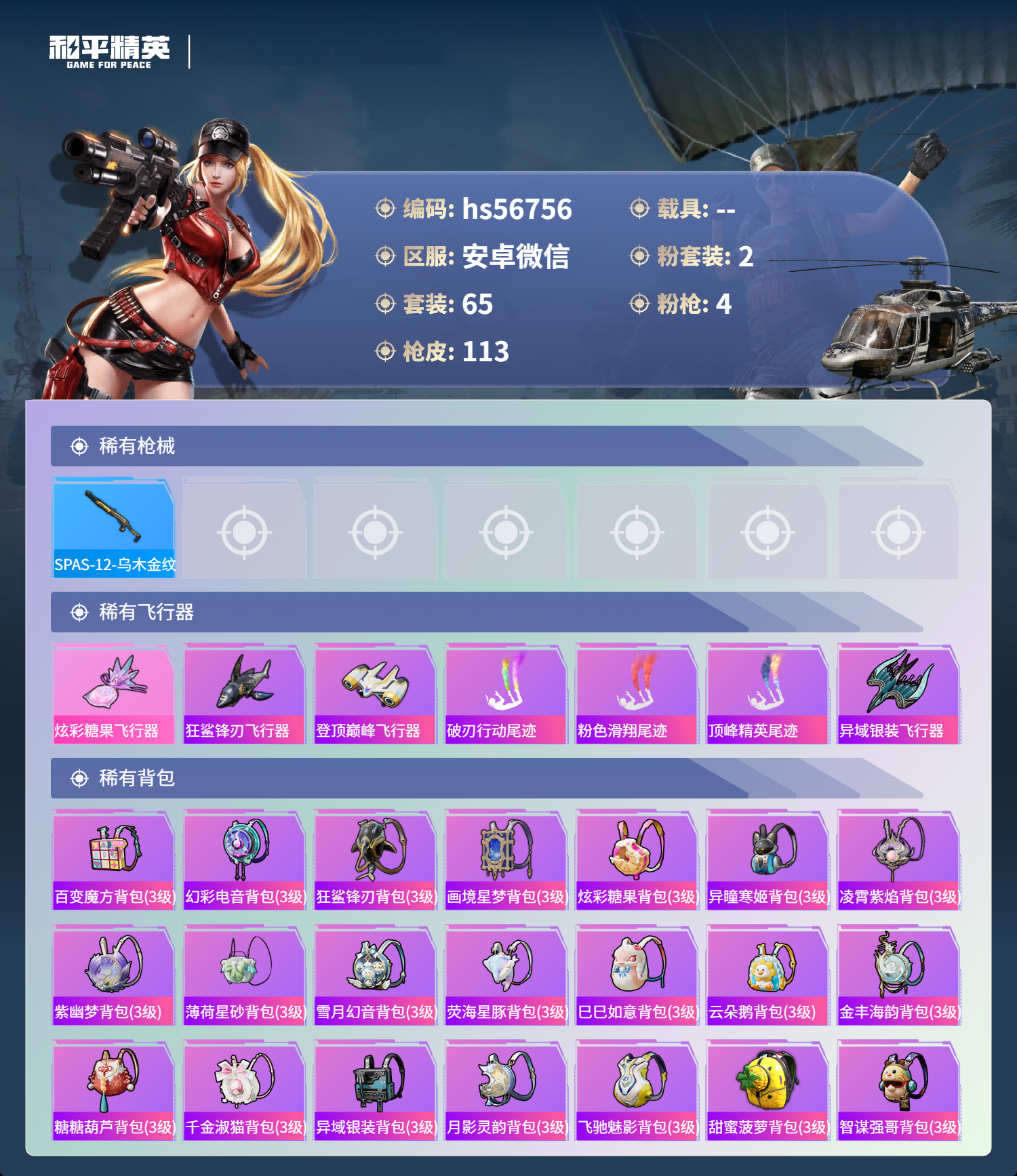 PX_2398251-,,安卓微信-6王牌印记-2粉装-4特效枪-31926热力值-65套装-113枪皮-3卓越印记-2传奇印记