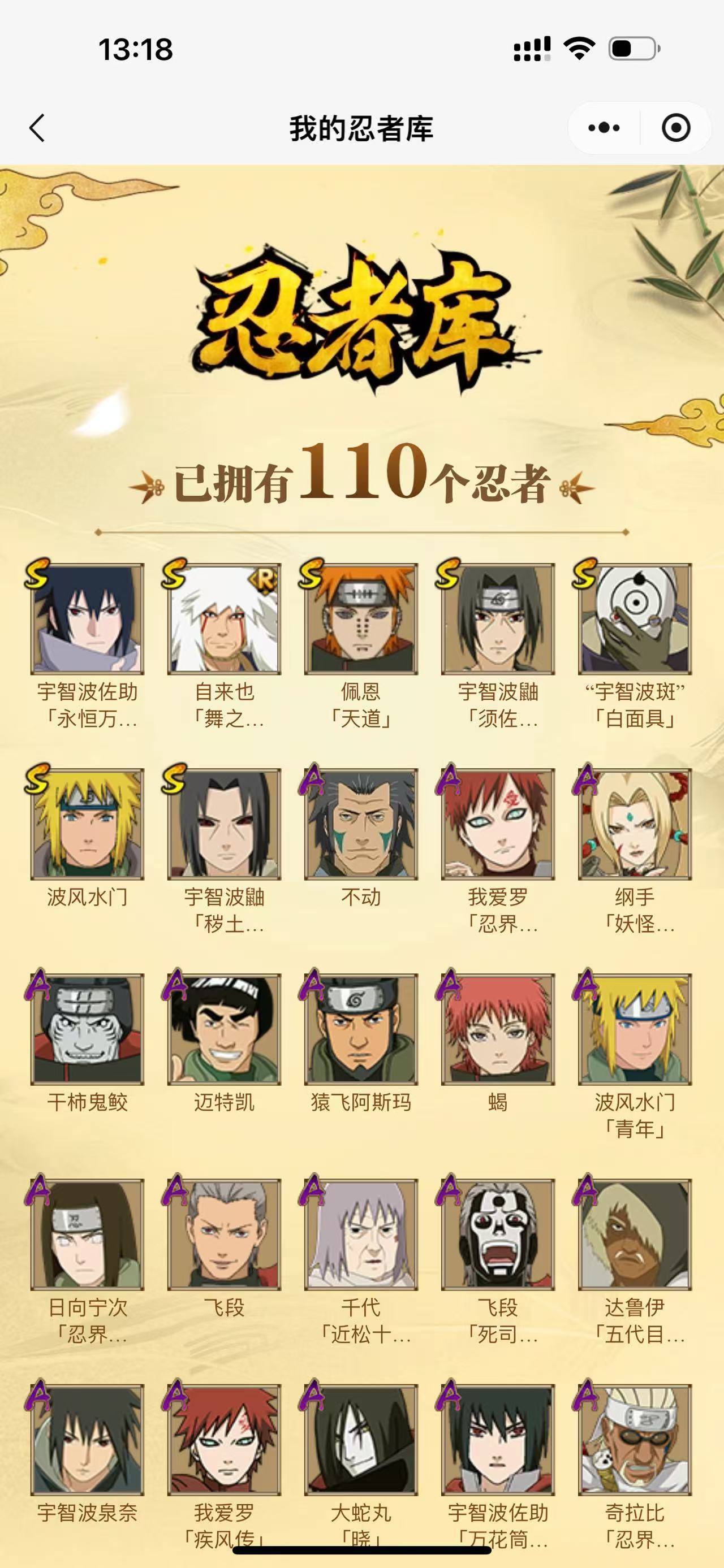 【A忍者】,纲手「妖怪奇谭」,日向宁次「忍界大战」,不动,宇智波泉奈,达鲁伊「五代目雷影」,波风水门「青年」,奇拉比「忍界大战」,迪达拉「秽土转生」,千代「近松十人卫」,我爱罗「忍界大战」,秋道丁次「忍界大战」,大蛇丸「晓」,宇智波佐助「万花筒写轮眼」,漩涡鸣人「仙人模式」,旗木卡卡西「万花筒写轮眼」,飞段「死司凭血」,飞段,我爱罗「疾风传」,蝎,干柿鬼鲛,猿飞阿斯玛,迈特凯,
