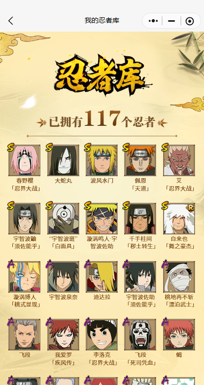 【A忍者】,巳月「仙人模式」,迈特凯「青春爆炸」,长十郎「六代目水影」,不缘,漩涡博人「桃式显现」,李洛克「忍界大战」,蝎「绯流琥」,宇智波泉奈,不风,神秘面具男「忍者之路」,波风水门「青年」,宇智波佐助「须佐能乎」,桃地再不斩「漂泊武士」,秋道丁次「忍界大战」,宇智波佐助「万花筒写轮眼」,奇拉比,飞段「死司凭血」,飞段,迪达拉,我爱罗「疾风传」,蝎,干柿鬼鲛,猿飞阿斯玛,迈特凯,