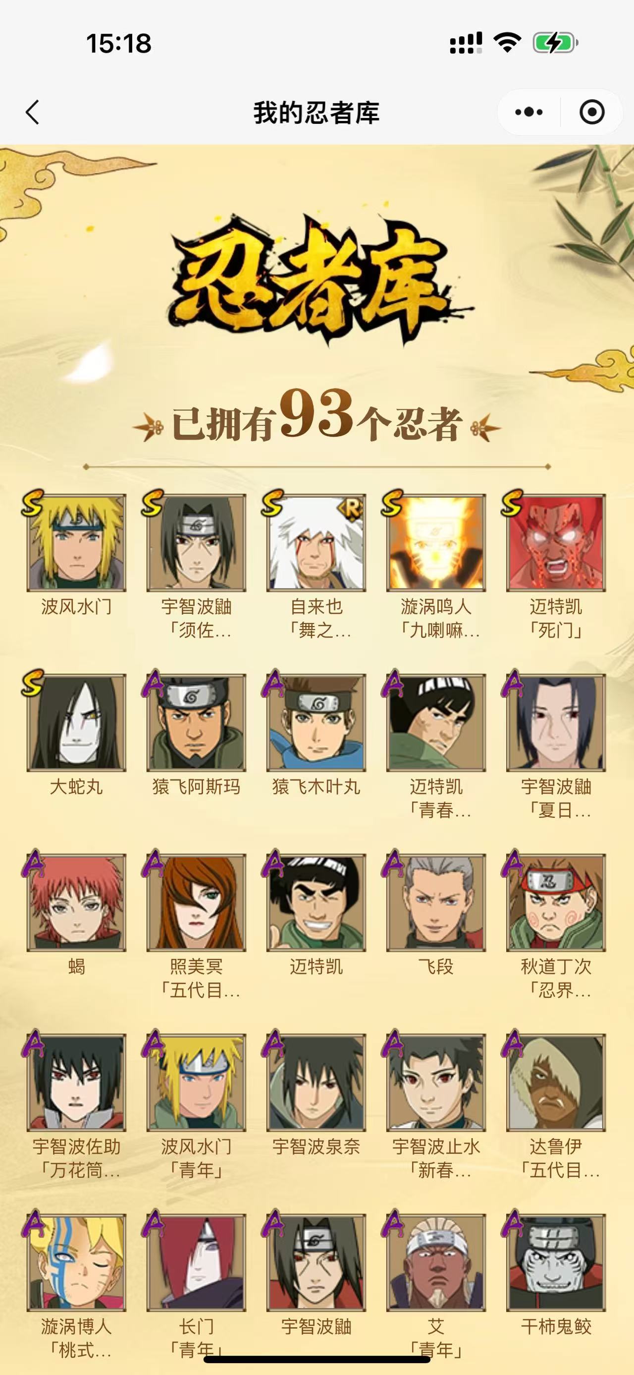 【A忍者】,迈特凯「青春爆炸」,漩涡博人「桃式显现」,宇智波鼬「夏日限定」,宇智波泉奈,长门「青年」,艾「青年」,达鲁伊「五代目雷影」,波风水门「青年」,宇智波止水「新春限定」,秋道丁次「忍界大战」,照美冥「五代目水影」,宇智波佐助「万花筒写轮眼」,飞段,迪达拉,蝎,干柿鬼鲛,宇智波鼬,猿飞阿斯玛,迈特凯,