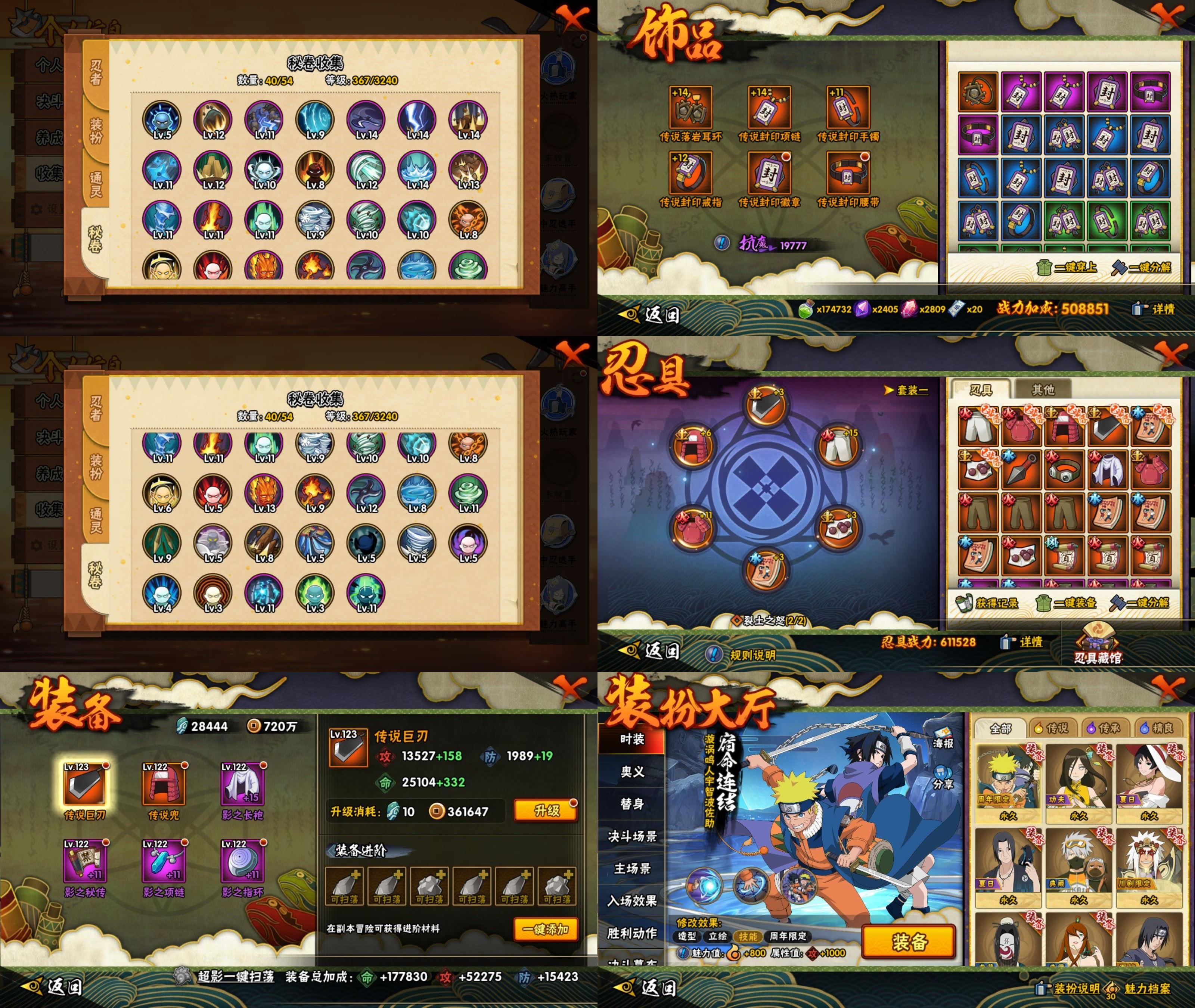 【A忍者】,机械鸣人「初始形态」,大野木「侠隐江湖」,纲手「妖怪奇谭」,巳月「仙人模式」,迈特凯「青春爆炸」,宇智波鼬「夏日限定」,旗木卡卡西「幻之真容」,蝎「绯流琥」,宇智波泉奈,宇智波带土「漂泊浪客」,神农「羁绊」,桃地再不斩「秽土转生」,波风水门「青年」,旗木卡卡西「元气夏日」,照美冥「夏日泳装」,大蛇丸「晓」,飞段,迪达拉,干柿鬼鲛,宇智波鼬,猿飞阿斯玛,迈特凯,