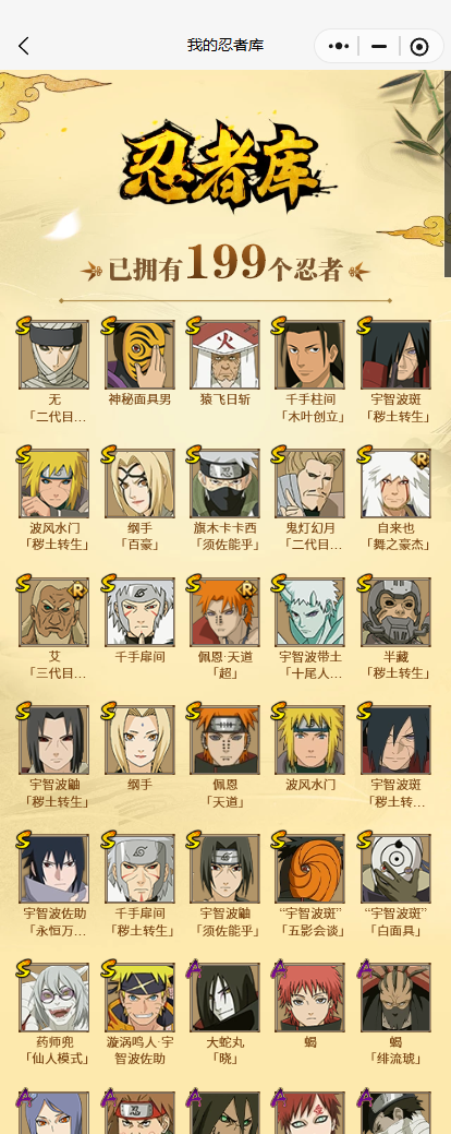【A忍者】,机械鸣人「初始形态」,大野木「侠隐江湖」,巳月「仙人模式」,迈特凯「青春爆炸」,宇智波佐助「侠隐江湖」,长十郎「六代目水影」,漩涡博人「桃式显现」,宇智波鼬「夏日限定」,李洛克「忍界大战」,蝎「绯流琥」,宇智波泉奈,桃地再不斩「秽土转生」,角都「秽土转生」,波风水门「青年」,宇智波佐助「须佐能乎」,迪达拉「秽土转生」,照美冥「夏日泳装」,漩涡鸣人「九尾查克拉」,千代「近松十人卫」,药师兜「半蛇斗篷」,我爱罗「忍界大战」,小南「夏日泳装」,秋道丁次「忍界大战」,大蛇丸「晓」,春野樱「百豪」,波风水门「新春限定」,宇智波佐助「万花筒写轮眼」,漩涡鸣人「仙人模式」,飞段「死司凭血」,小南,飞段,迪达拉,我爱罗「疾风传」,蝎,干柿鬼鲛,宇智波鼬,猿飞阿斯玛,迈特凯,