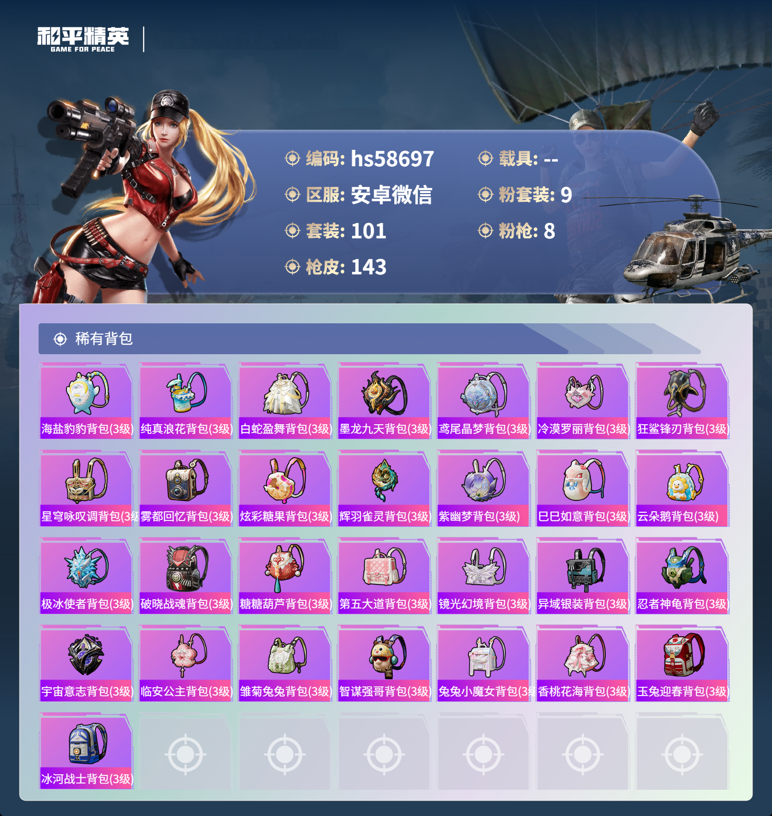 【29稀有背包】海盐豹豹背包(3级),纯真浪花背包(3级),白蛇盈舞背包(3级),墨龙九天背包(3级),鸢尾晶梦背包(3级),冷漠罗丽背包(3级),狂鲨锋刃背包(3级),星穹咏叹调背包(3级),雾都回忆背包(3级),炫彩糖果背包(3级),辉羽雀灵背包(3级),紫幽梦背包(3级),巳巳如意背包(3级),云朵鹅背包(3级),极冰使者背包(3级),破晓战魂背包(3级),糖糖葫芦背包(3级),第五大道背包(3级),镜光幻境背包(3级),异域银装背包(3级),忍者神龟背包(3级),宇宙意志背包(3级),临安公主背包(3级),雏菊兔兔背包(3级),智谋强哥背包(3级),兔兔小魔女背包(3级),香桃花海背包(3级),玉兔迎春背包(3级),冰河战士背包(3级)