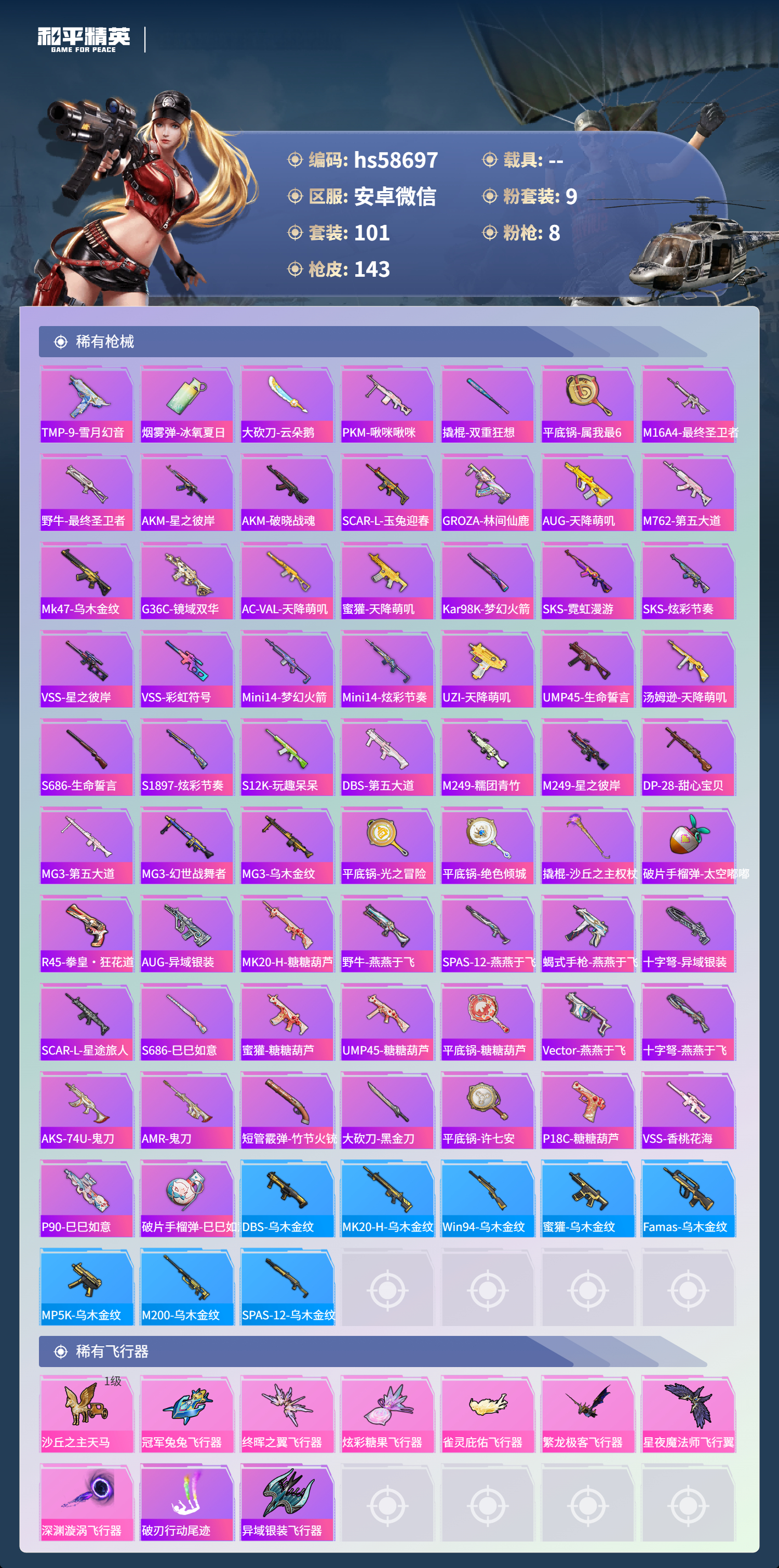 【143稀有枪械】UZI-梦海之灵,QBZ-纯真浪花,AWM-纯真浪花,汤姆逊-纯真浪花,DBS-乌木金纹,AA12-G-纯真浪花,平底锅-纯真浪花,P1911-创世·救赎,AKM-霓彩节奏,Famas-墨龙九天,蝎式手枪-奶油梦幻熊,UZI-霓彩节奏,S1897-精灵梦叶罗丽,SCAR-L-海盐豹豹,GROZA-海盐豹豹,TMP-9-霓彩节奏,AUG-圣斗士星矢/7级,AUG-许七安/5级,Kar98K-巳巳如意/5级,MG3-辉羽雀灵/3级,AKM-魔法神域/3级,SCAR-L-时空协奏/3级,Vector-最终圣卫者/3级,SLR-金丰海韵,SLR-极冰使者,野牛-雏菊兔兔,蝎式手枪-金丰海韵,Mk14-冰河战士,平底锅-雏菊兔兔,M762-雏菊兔兔,Mini14-雏菊兔兔,Famas-突变脉冲,短管霰弹-宇宙意志,R1895-雏菊兔兔,AC-VAL-宇宙意志,撬棍-突变脉冲,AUG-兔兔小魔女,M416-极冰使者,M249-金丰海韵,UZI-冰河战士,Famas-涂鸦旋风,UMP45-涂鸦旋风,M16A4-冰河战士,MK20-H-乌木金纹,M417-第五大道/4级,Win94-乌木金纹,SVD-冷漠罗丽,撬棍-冷漠罗丽,PKM-紫幽梦,MG3-霓彩脉冲,SCAR-L-冷漠罗丽,Mk14-紫幽梦,蜜獾-乌木金纹,M762-云朵鹅,S1897-紫幽梦,SVD-云朵鹅,P92-紫幽梦,M417-玩趣呆呆,MK20-H-狂鲨锋刃,燃点复合弓-幻海仙踪,铝热弹-炫彩糖果,UZI-炫彩糖果,平底锅-紫幽梦,AMR-雾都回忆,破片手榴弹-海盐豹豹,汤姆逊-雾都回忆,PKM-雾都回忆,UMP45-海盐豹豹,Famas-乌木金纹,SPAS-12-云朵鹅,SVD-天籁学园,S1897-糯团青竹,P90-天籁学园,S12K-智耀战神,沙漠之鹰-云朵鹅,TMP-9-雪月幻音,烟雾弹-冰氧夏日,大砍刀-云朵鹅,PKM-啾咪啾咪,撬棍-双重狂想,平底锅-属我最6,M16A4-最终圣卫者,野牛-最终圣卫者,AKM-星之彼岸,AKM-破晓战魂,SCAR-L-玉兔迎春,GROZA-林间仙鹿,AUG-天降萌叽,M762-第五大道,Mk47-乌木金纹,G36C-镜域双华,AC-VAL-天降萌叽,蜜獾-天降萌叽,Kar98K-梦幻火箭,SKS-霓虹漫游,SKS-炫彩节奏,VSS-星之彼岸,VSS-彩虹符号,Mini14-梦幻火箭,Mini14-炫彩节奏,UZI-天降萌叽,UMP45-生命誓言,汤姆逊-天降萌叽,MP5K-乌木金纹,S686-生命誓言,S1897-炫彩节奏,S12K-玩趣呆呆,DBS-第五大道,M249-糯团青竹,M249-星之彼岸,DP-28-甜心宝贝,MG3-第五大道,MG3-幻世战舞者,MG3-乌木金纹,平底锅-光之冒险,平底锅-绝色倾城,撬棍-沙丘之主权杖,破片手榴弹-太空嘟嘟,R45-拳皇·狂花道,AUG-异域银装,MK20-H-糖糖葫芦,野牛-燕燕于飞,M200-乌木金纹,SPAS-12-燕燕于飞,蝎式手枪-燕燕于飞,十字弩-异域银装,SCAR-L-星途旅人,S686-巳巳如意,蜜獾-糖糖葫芦,UMP45-糖糖葫芦,SPAS-12-乌木金纹,平底锅-糖糖葫芦,Vector-燕燕于飞,十字弩-燕燕于飞,AKS-74U-鬼刀,AMR-鬼刀,短管霰弹-竹节火铳,大砍刀-黑金刀,平底锅-许七安,P18C-糖糖葫芦,VSS-香桃花海,P90-巳巳如意,破片手榴弹-巳巳如意