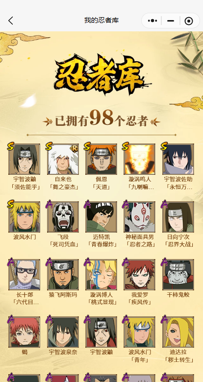 【A忍者】,迈特凯「青春爆炸」,长十郎「六代目水影」,日向宁次「忍界大战」,漩涡博人「桃式显现」,不动,宇智波泉奈,长门「青年」,神秘面具男「忍者之路」,波风水门「青年」,宇智波佐助「须佐能乎」,迪达拉「秽土转生」,千代「近松十人卫」,秋道丁次「忍界大战」,奇拉比,飞段「死司凭血」,我爱罗「疾风传」,蝎,干柿鬼鲛,宇智波鼬,猿飞阿斯玛,