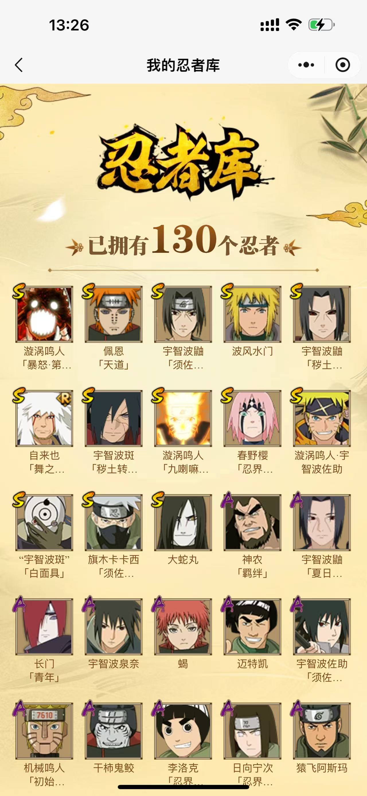 【A忍者】,机械鸣人「初始形态」,大野木「侠隐江湖」,巳月「仙人模式」,迈特凯「青春爆炸」,土台「忍界大战」,旗木卡卡西「幻之真容」,蝎「绯流琥」,宇智波泉奈,宇智波带土「漂泊浪客」,桃地再不斩「秽土转生」,宇智波佐助「须佐能乎」,旗木卡卡西「忍界大战」,漩涡鸣人「九尾查克拉」,千代「近松十人卫」,秋道丁次「忍界大战」,宇智波佐助「万花筒写轮眼」,飞段「死司凭血」,飞段,蝎,干柿鬼鲛,猿飞阿斯玛,迈特凯,
