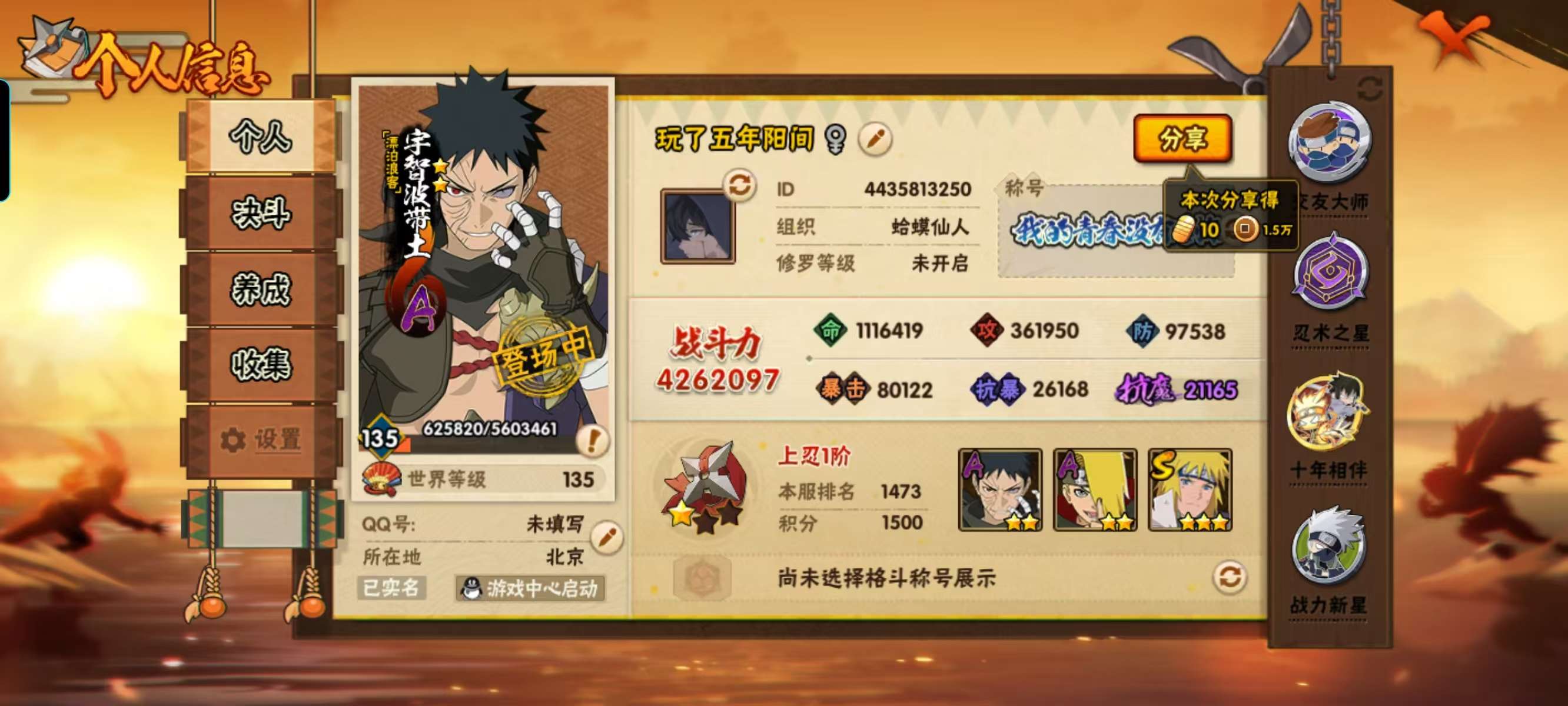 PX_2434029-,秽土解斑】【S忍者8,A忍者24,通灵14】【安卓Q-3581区-135级-V6-426万战力-105忍者】【S级】佩恩「天道」,旗木卡卡西「须佐能乎」,自来也「舞之豪杰」,宇智波鼬「须佐能乎」,宇智波斑「秽土转生·解」,波风水门,猿飞日斩「秽土转生」,漩涡鸣人·宇智波佐助【A级】不动,蝎,迈特凯「青春爆炸」,宇智波泉奈,蝎「绯流琥」,迪达拉,猿飞阿斯玛,药师兜「半