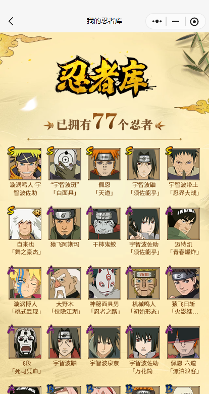 【A忍者】,机械鸣人「初始形态」,大野木「侠隐江湖」,迈特凯「青春爆炸」,漩涡博人「桃式显现」,宇智波泉奈,佩恩·六道「漂泊浪客」,神秘面具男「忍者之路」,宇智波佐助「须佐能乎」,猿飞日斩「火影继承人」,宇智波佐助「万花筒写轮眼」,飞段「死司凭血」,干柿鬼鲛,宇智波鼬,猿飞阿斯玛,迈特凯,