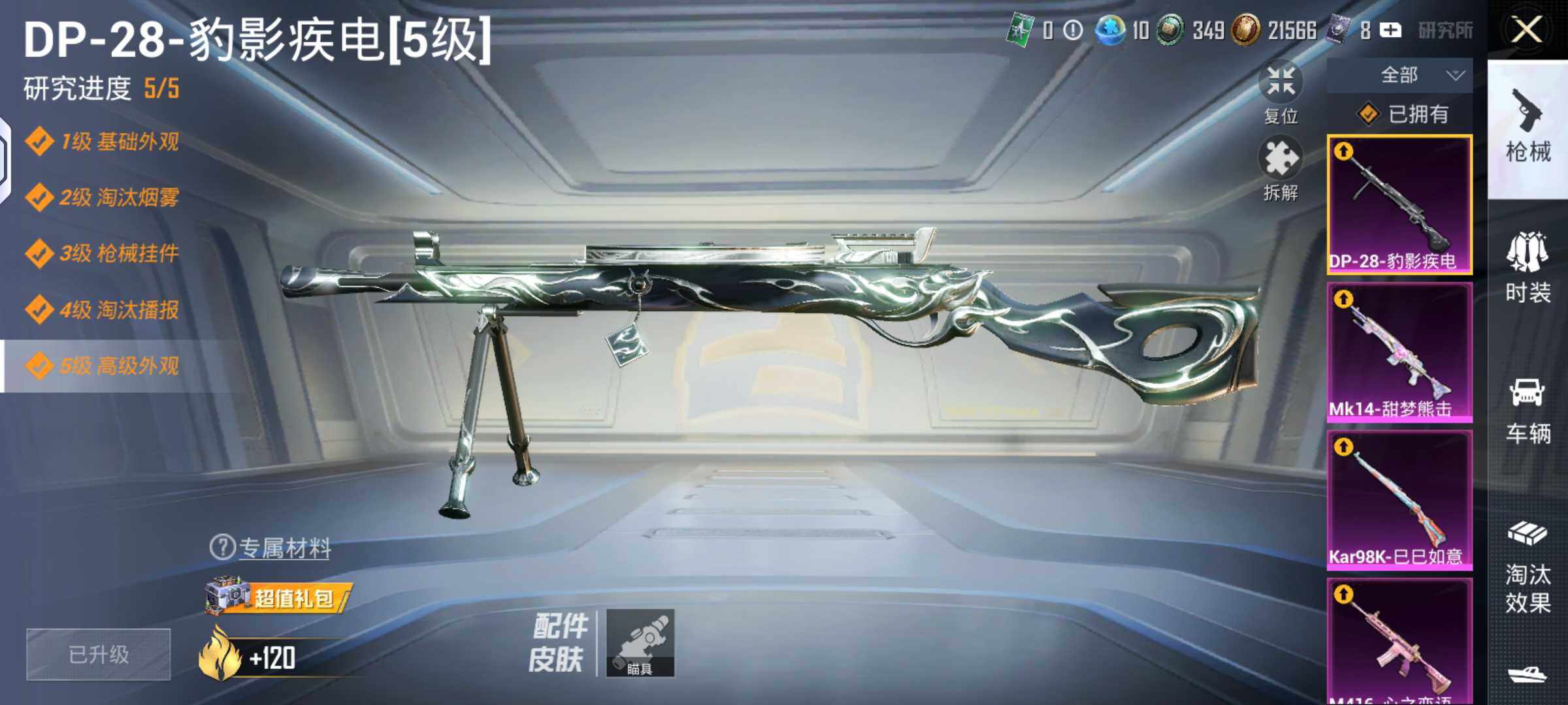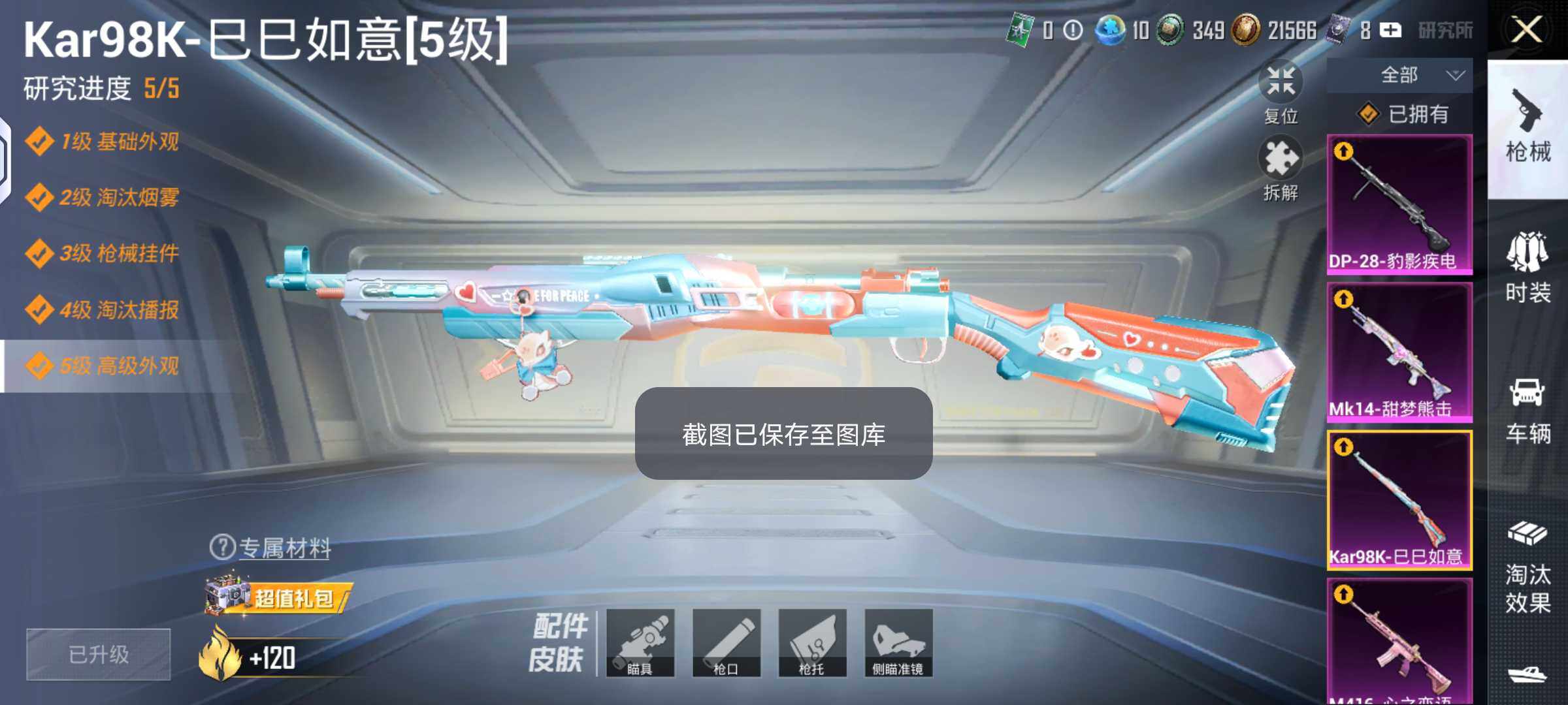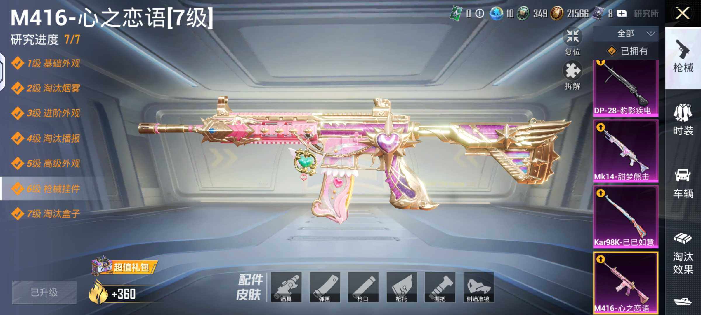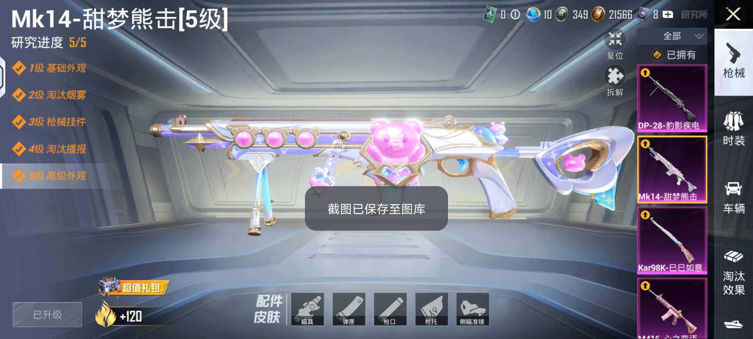 【粉色枪皮等级】:M416-心之恋语(七级),Kar98K-巳巳如意(五级),Mk14-甜梦熊击(五级),DP-28-豹影疾电(五级)