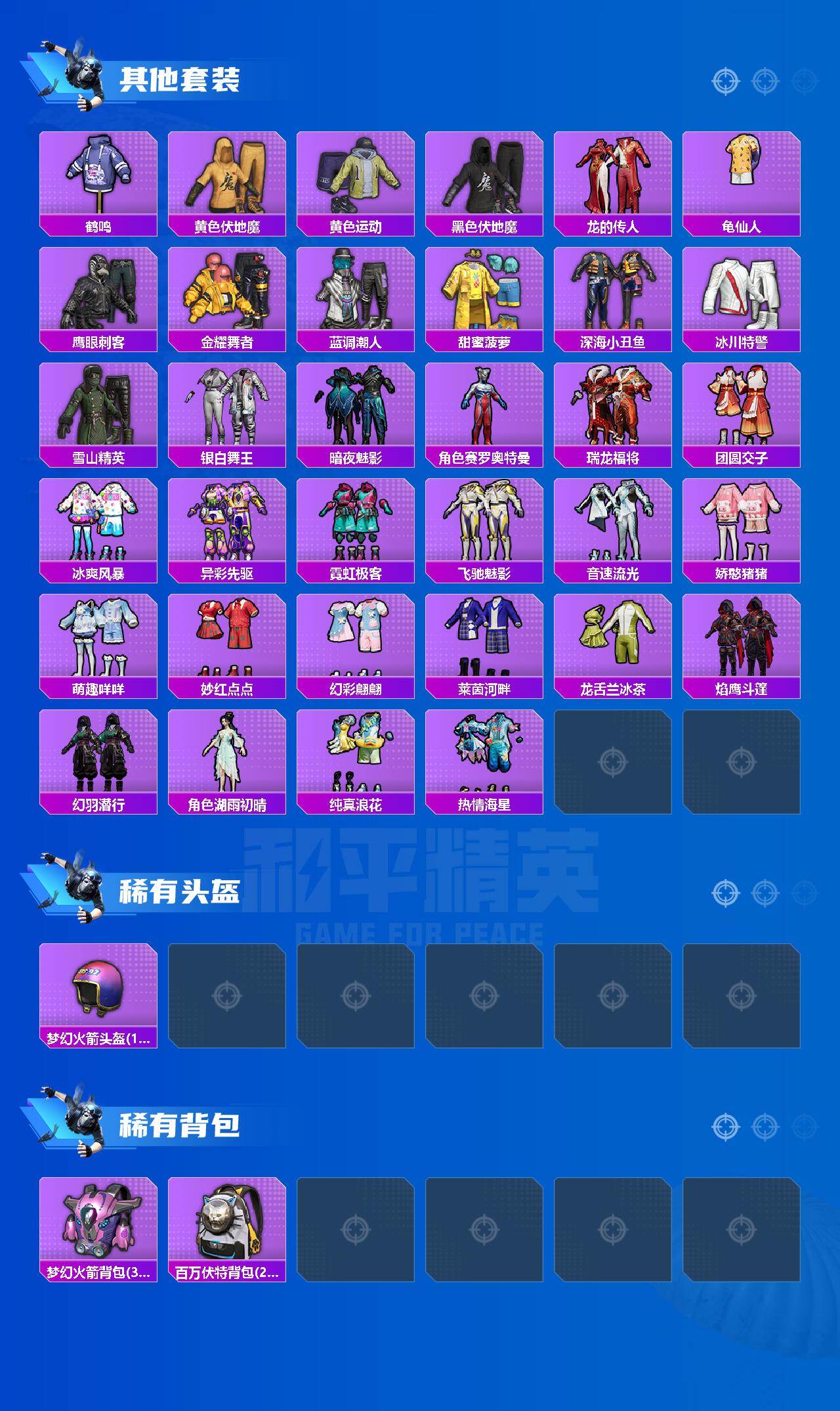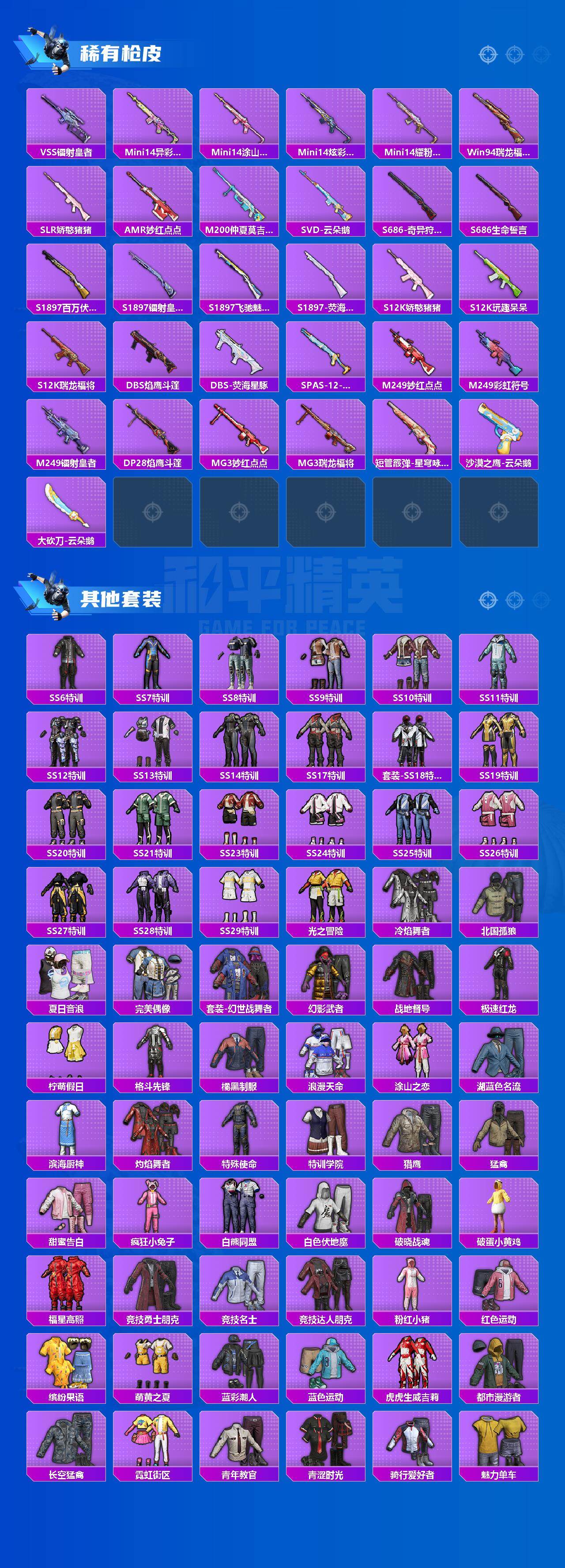 【稀有枪皮】:AKM-冰凉西瓜,AKM-夜灯,AKM-彩虹符号,AKM-灼热熔岩,AKM-破晓战魂,AKM-虎虎生威,AKM-霓虹街区,M16A4-幻世战舞者,SCAR-L-炫彩节奏,SCAR-L-红色方程式,SCAR-L-黄金龙骨,M416-夜灯,M416-糯团青竹,M416-紫翼圣骑,M416-红色方程式,GROZA-异彩先驱,GROZA-恐龙拽拽,GROZA-治愈之星,AUG-天降萌叽,AUG-耀粉歌者,QBZ-飞驰魅影,M762-天降萌叽,M762-牛气冲天,M762-瑞龙福将,M762-镭射皇者,M762-云朵鹅,Mk47-妙红点点,G36C-暗夜玫瑰,G36C-炙焰牛王,AC-VAL-闲梦青缨,蜜獾-娇憨猪猪,UZI-天降萌叽,UZI-娇憨猪猪,UZI-炫彩节奏,UMP45-夜灯,UMP45-诡娃娃,Vector-焰鹰斗篷,Vector-彩虹符号,Vector-暗夜玫瑰,Vector-生命誓言,汤姆逊-异彩先驱,汤姆逊-耀粉歌者,MP5K-异彩先驱,P90-飞驰魅影,P90-巳巳如意,Kar98K-彩虹符号,Kar98K-炫彩节奏,Kar98K-电玩视界,Kar98K-飞驰魅影,M24-奇异狩猎者,AWM-焰鹰斗篷,AWM-圣堂之誓,SKS-心之恋语,VSS-彩虹符号,VSS-镭射皇者,Mini14-异彩先驱,Mini14-涂山之恋,Mini14-炫彩节奏,Mini14-耀粉歌者,Win94-瑞龙福将,SLR-娇憨猪猪,