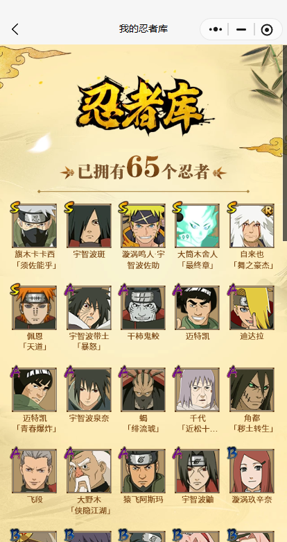 【A忍者】,大野木「侠隐江湖」,迈特凯「青春爆炸」,蝎「绯流琥」,宇智波泉奈,角都「秽土转生」,宇智波带土「暴怒」,千代「近松十人卫」,飞段,迪达拉,干柿鬼鲛,宇智波鼬,猿飞阿斯玛,迈特凯,