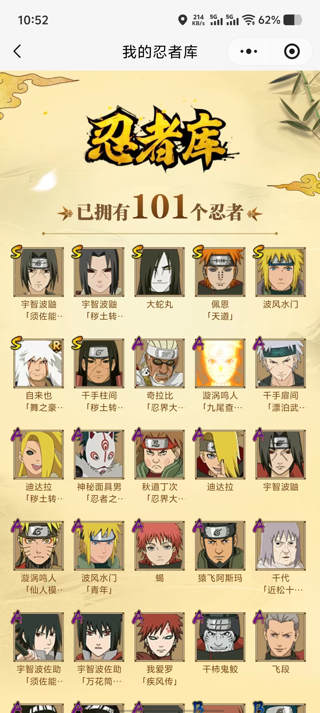 【A忍者】,迈特凯「青春爆炸」,宇智波泉奈,神秘面具男「忍者之路」,波风水门「青年」,千手扉间「漂泊武士」,奇拉比「忍界大战」,宇智波佐助「须佐能乎」,迪达拉「秽土转生」,漩涡鸣人「九尾查克拉」,千代「近松十人卫」,秋道丁次「忍界大战」,宇智波佐助「万花筒写轮眼」,漩涡鸣人「仙人模式」,飞段,迪达拉,我爱罗「疾风传」,蝎,干柿鬼鲛,宇智波鼬,猿飞阿斯玛,迈特凯,